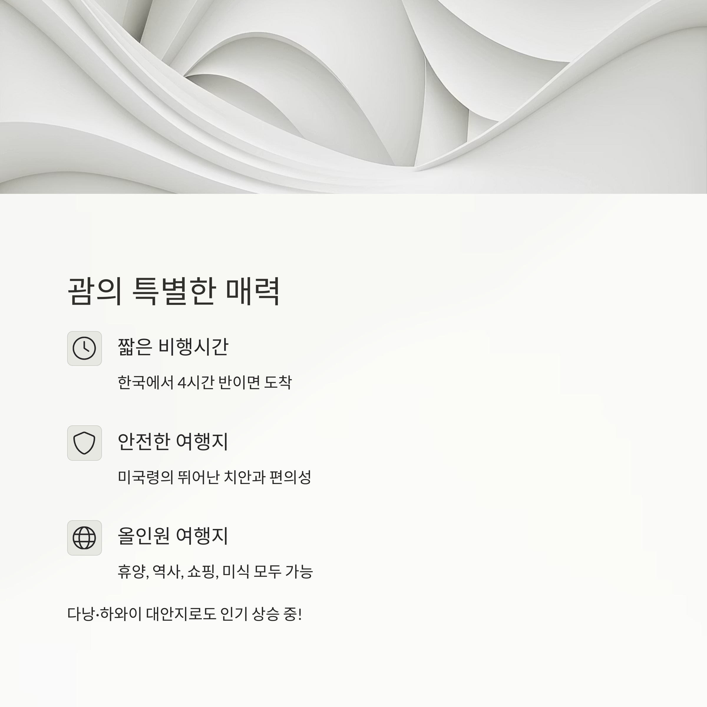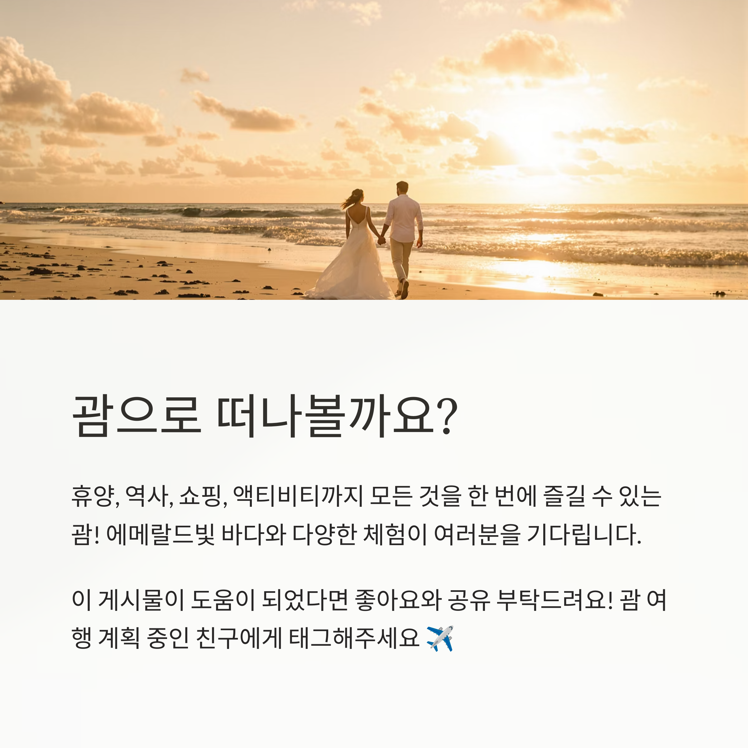 괌은 단순한 휴양지만이 아니라 역사, 문화, 쇼핑, 미식 등 다양한 테마 여행이 가능한 곳이에요. 가족 단위 관광객은 물론, **신혼여행, 다낭·하와이 대안지로도 인기**가 많아지고 있죠.
