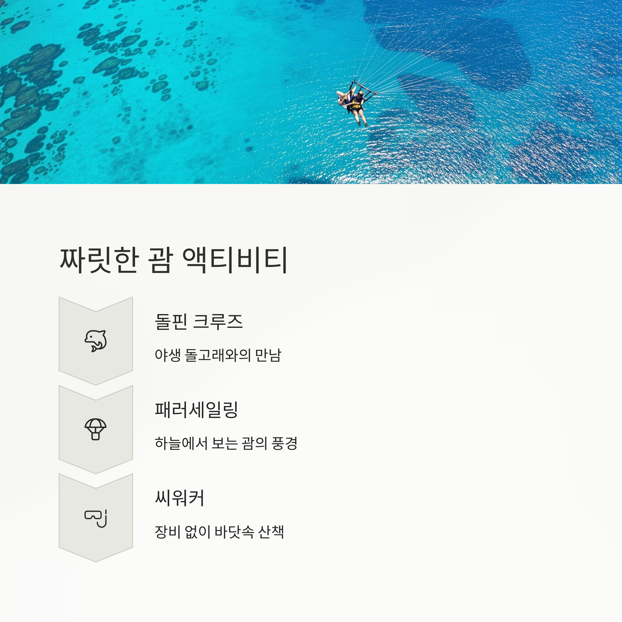 괌 여행에서 빠질 수 없는 게 바로 액티비티예요! 단순히 해수욕에서 끝나지 않고, 스릴과 감성을 동시에 잡을 수 있는 특별한 체험들이 가득해요.