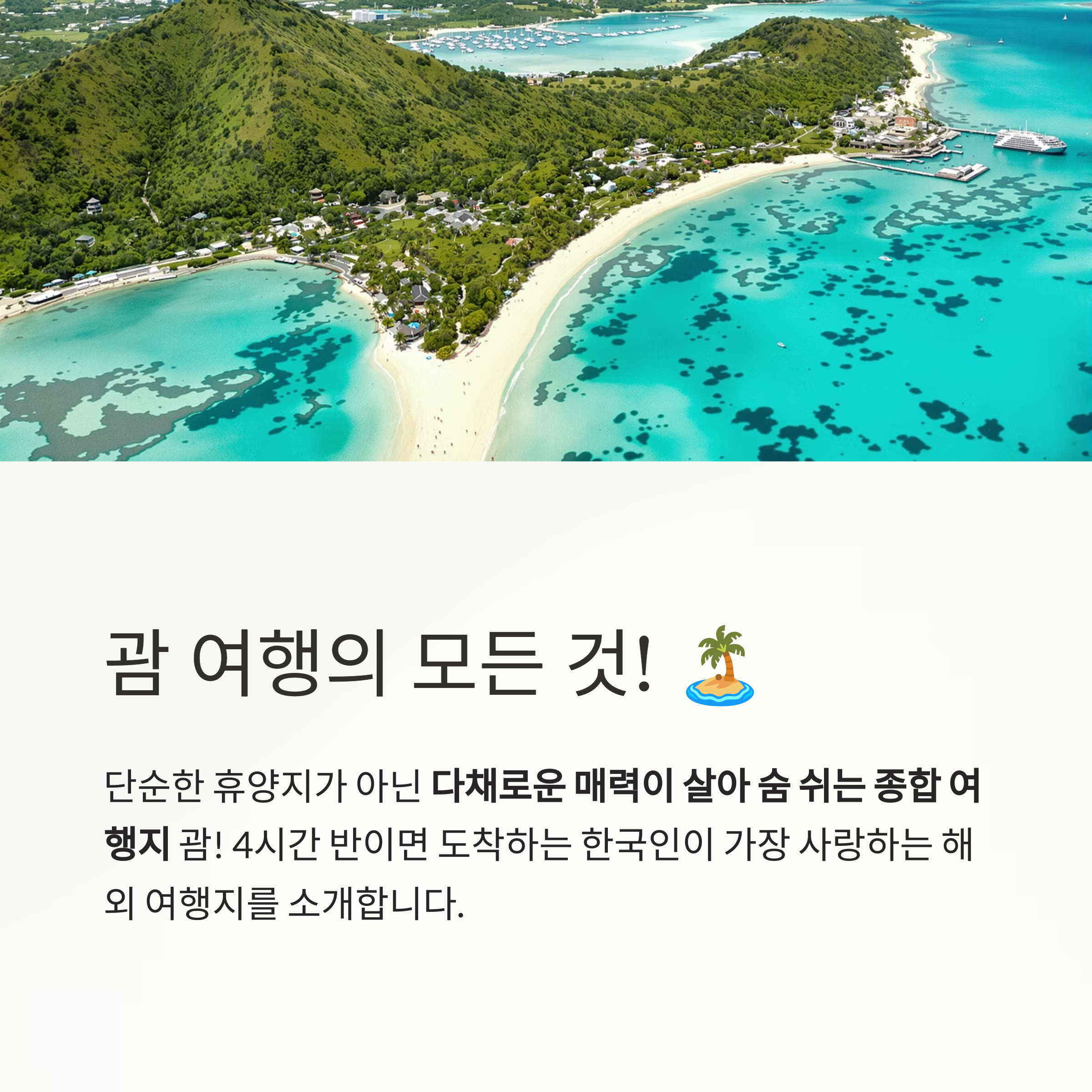 "괌은 생각보다 작지만, 알차고 탄탄한 여행 루트가 필요해요. 해변만 가는 건 괌의 절반만 보는 거예요!" - 여행 인플루언서 김하영