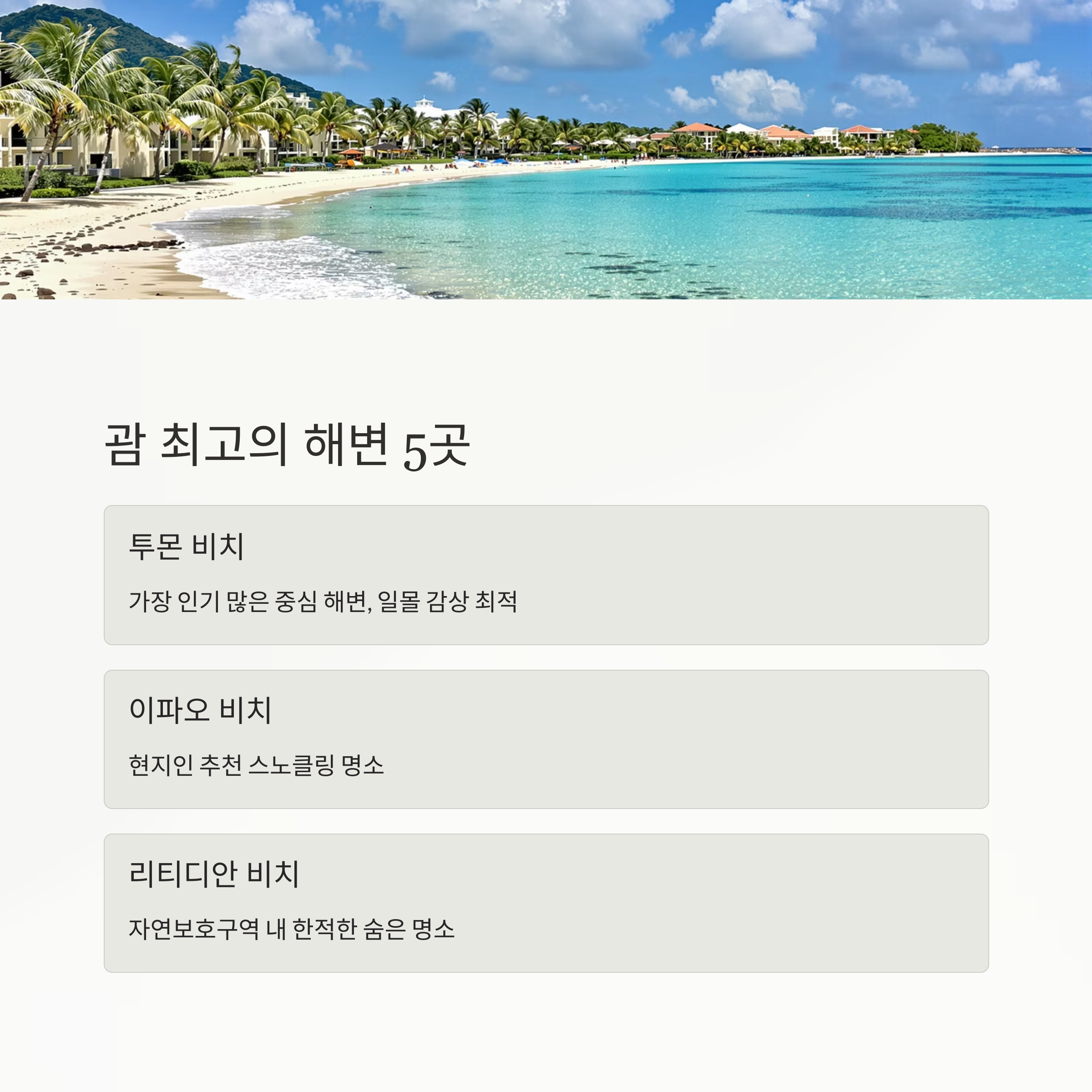 👉 다음은 괌에서 가장 아름다운 해변 TOP 5 소개예요 🌊