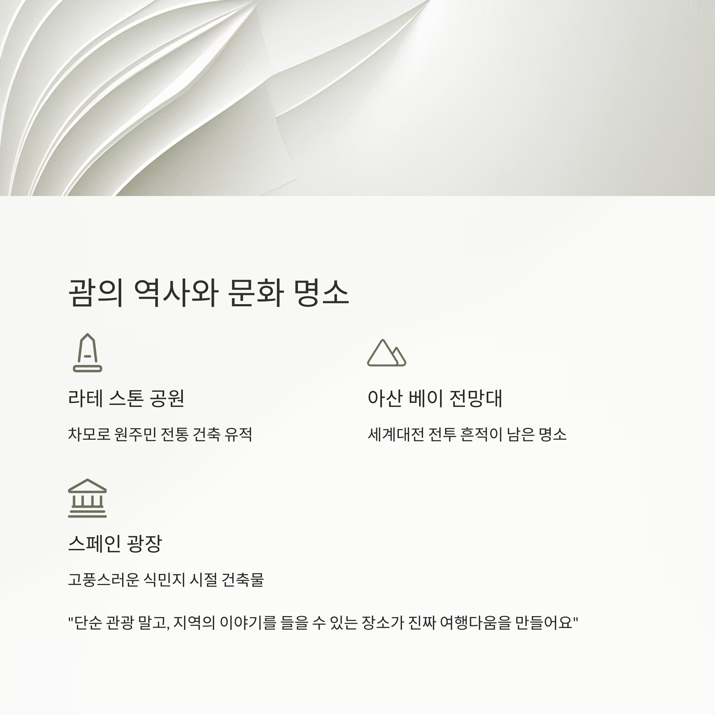 "괌은 휴양만 있는 게 아니에요. 식민지 역사와 차모로 문화가 함께 살아 있어요. 고요한 유적지를 걷다 보면 시간 여행하는 느낌이 들어요." - 역사 해설사 이나래