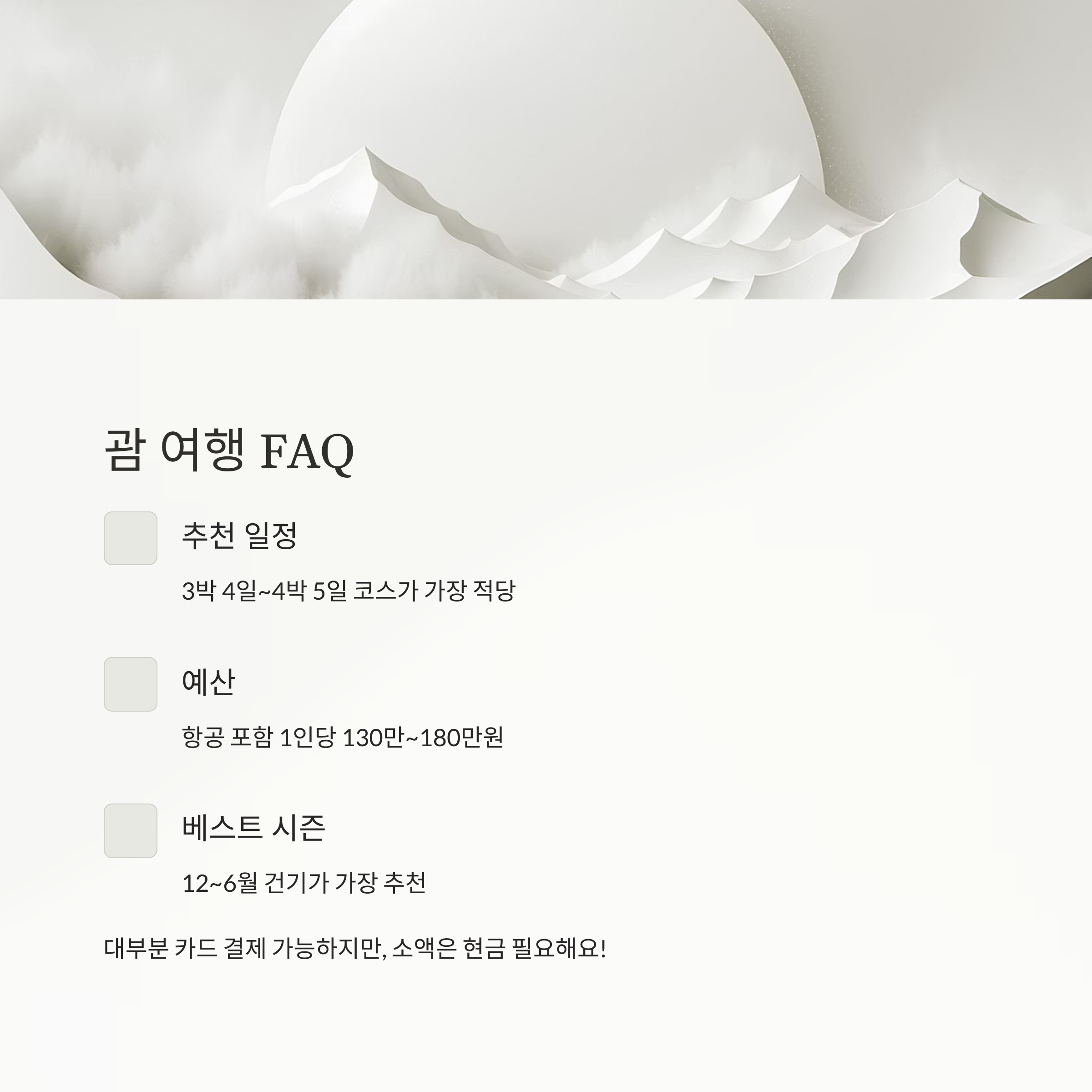 “괌이 그렇게 좋다는데, 그냥 휴양지 아니야?” 이런 생각 한 번쯤 해봤다면, 괌 여행에 대해 아직 잘 모르는 걸 수도 있어요. 휴양도, 쇼핑도, 역사도, 먹거리도 다 있는 괌은 단순한 섬이 아니라 **다채로운 매력이 살아 숨 쉬는 종합 여행지**예요.