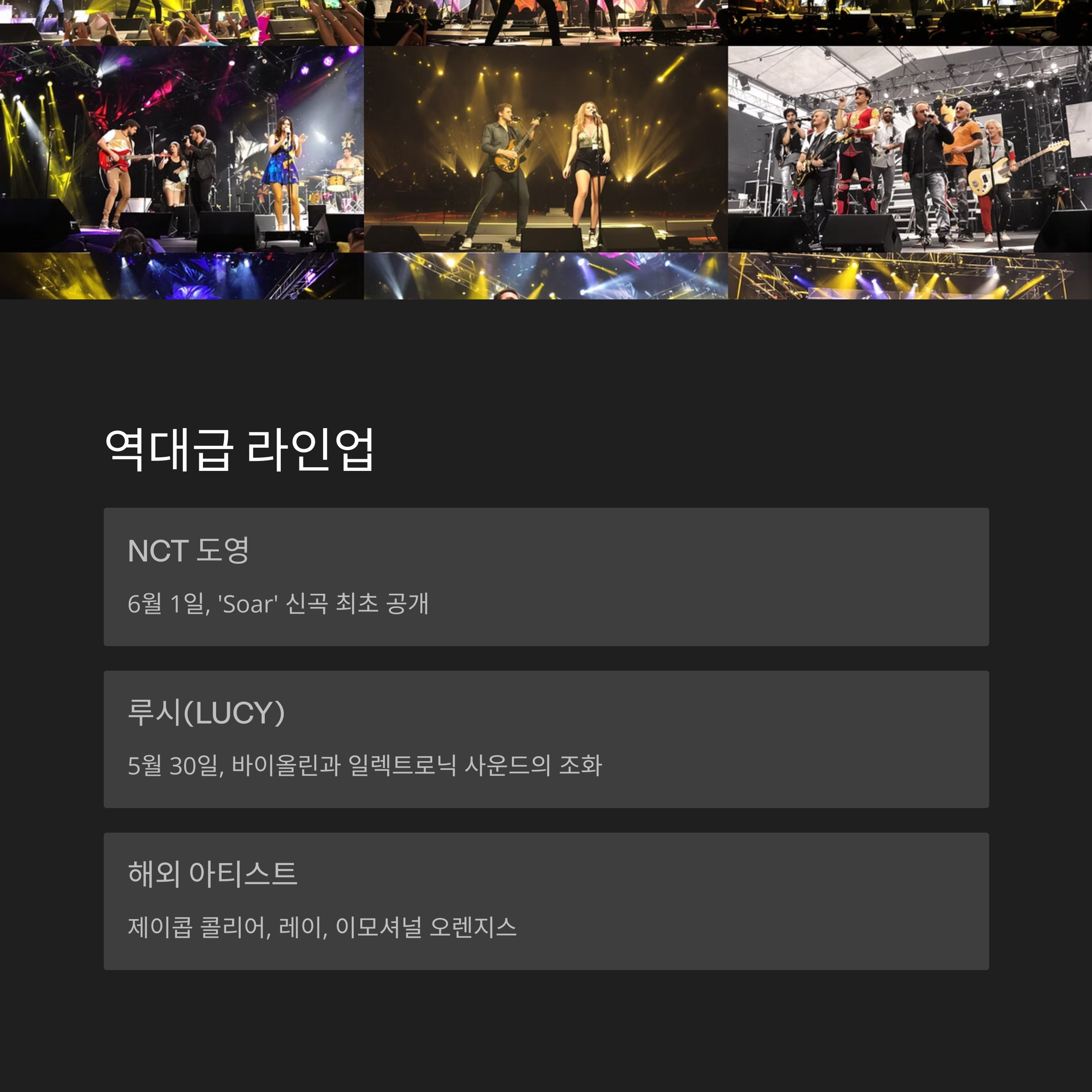 | 도영 (NCT) | 6월 1일 | 신곡 최초 공개, 팬 이벤트 부스 | K-Pop, 발라드 |