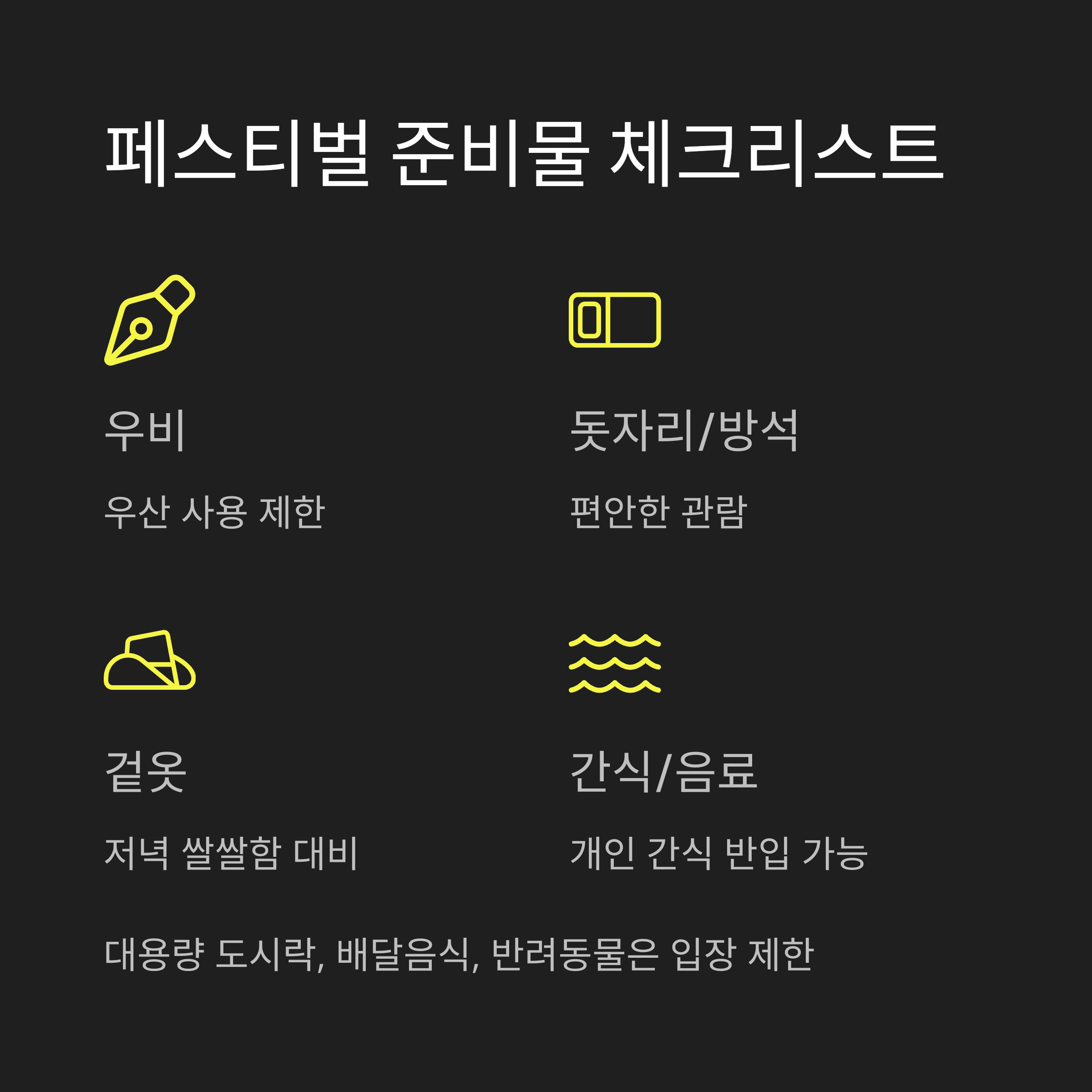 또한, 현장에는 지정 좌석이 없기 때문에 공연이 시작되기 전에 좋은 자리를 잡으려면 빠른 도착이 관건이에요. 돗자리나 방석을 챙겨가면 더 편안하게 관람할 수 있어요.