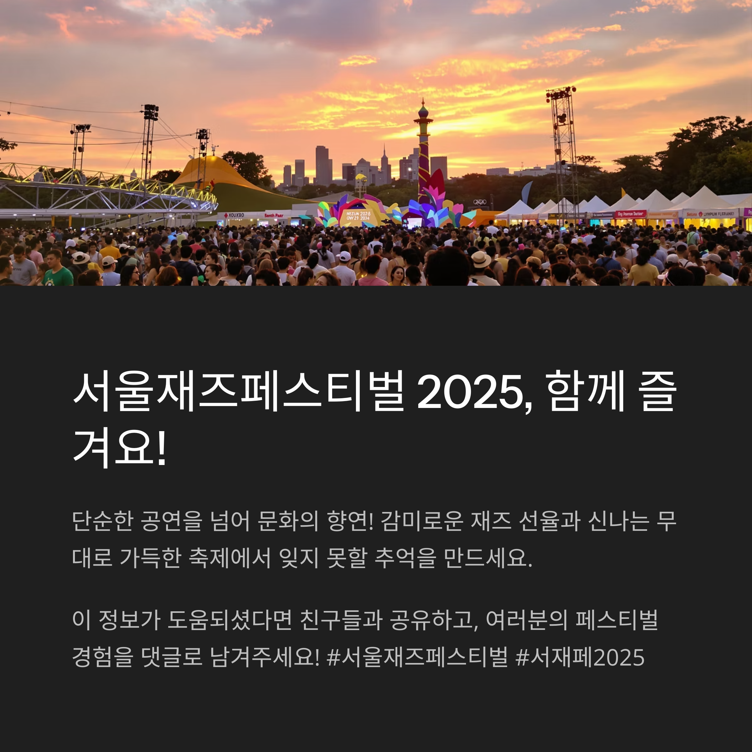 🎷 이렇게 해서 서울재즈페스티벌 2025에 대한 모든 정보를 정리해봤어요! 멋진 라인업, 실속 있는 예매 팁, 생생한 현장 이벤트까지 다 챙겨가셨죠? 이번 페스티벌은 단순한 음악을 넘어선 문화의 향연이니까, 마음껏 즐기고 사진도 많이 남기세요! 🎶