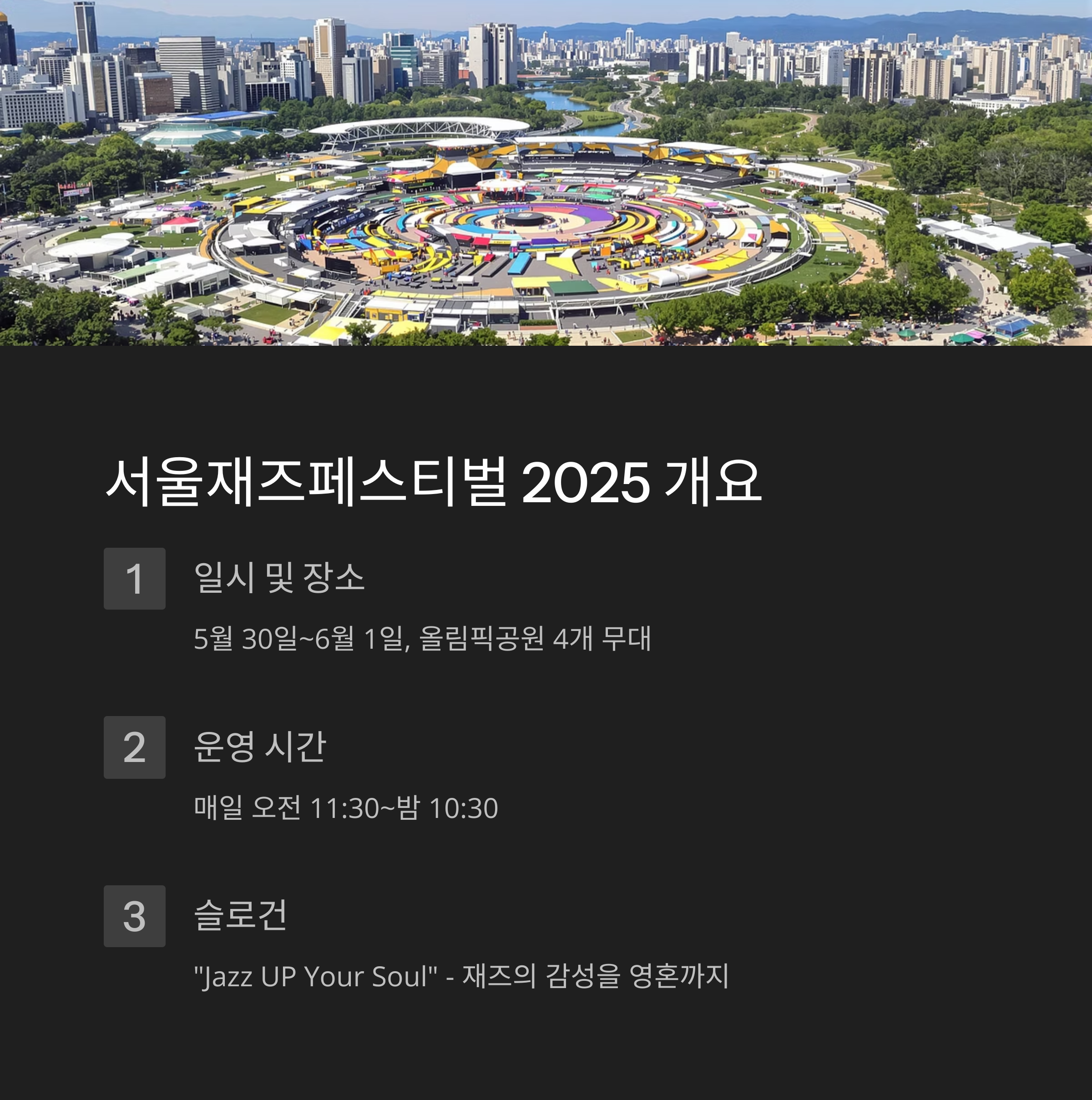 2025년 5월 30일부터 6월 1일까지 총 3일간 진행되는 이 축제는 매일 오전 11시 30분부터 밤 10시 30분까지 다양한 공연과 이벤트로 가득해요. 공식 슬로건은 “Jazz UP Your Soul”, 재즈의 감성을 영혼까지 끌어올려주겠다는 의미가 담겨 있답니다.