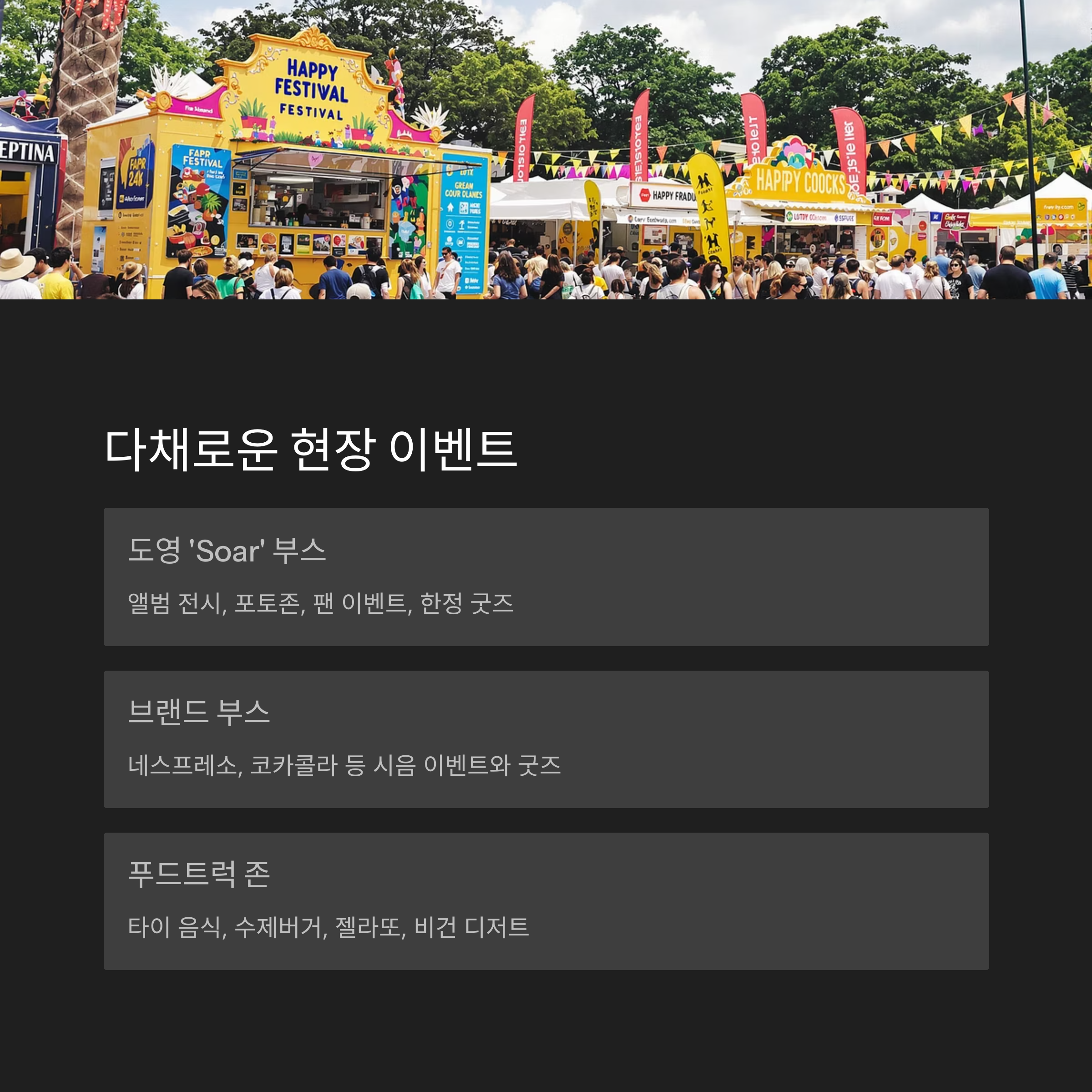 이제 예매를 완료했다면, 무엇을 더 준비해야 할까요? 🎈 바로 현장에서 펼쳐질 흥미로운 이벤트와 부스를 소개할 차례예요!