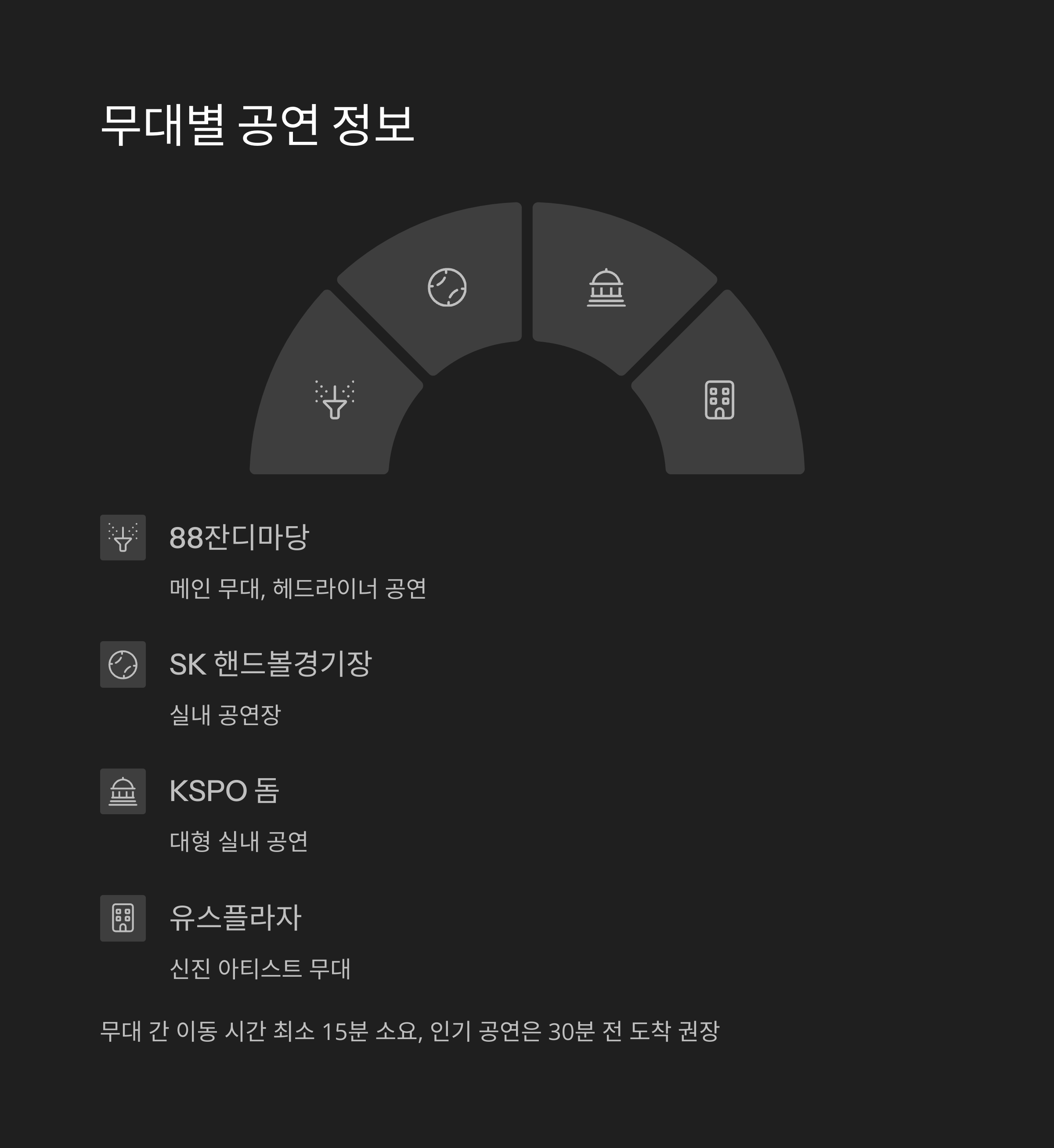 무대는 총 4곳이에요: 88잔디마당, SK 핸드볼경기장, KSPO 돔, 유스플라자. 이 중 실외 무대인 88잔디마당은 가장 큰 규모로, 주로 헤드라이너 아티스트의 공연이 열리는 장소예요. 인기 아티스트 공연 전에는 입장 줄이 길어지므로 30분 이상 일찍 이동하는 게 좋아요.