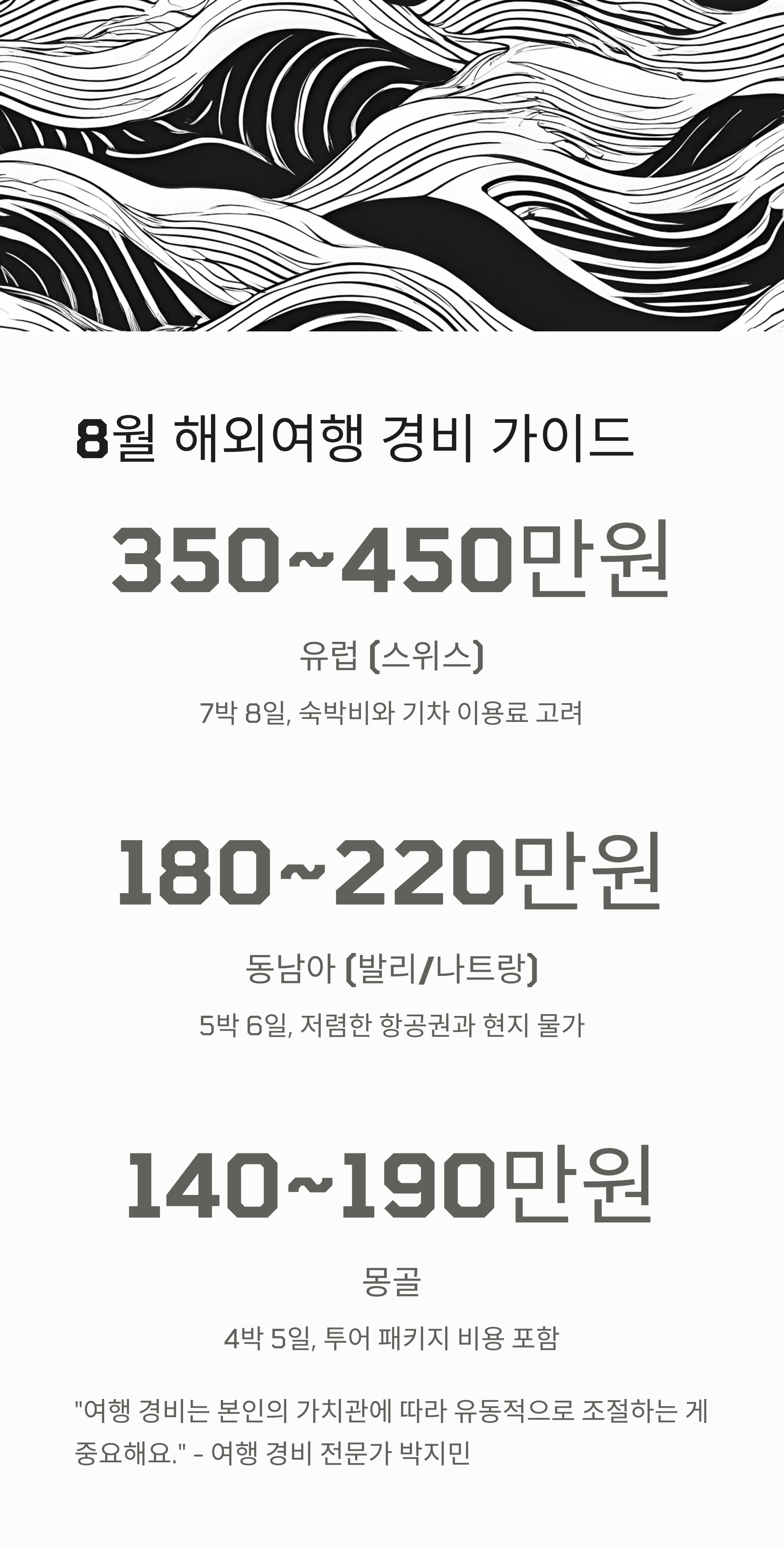 8월 해외여행지를 선택했다면, 이제 가장 현실적인 '경비'를 계획할 차례죠! 항공권, 숙박, 식비, 관광비용 등 다양한 요인에 따라 총 경비는 천차만별인데요. 하지만 대략적인 예산을 미리 세워두면 훨씬 알뜰하고 만족스러운 여행을 즐길 수 있답니다.