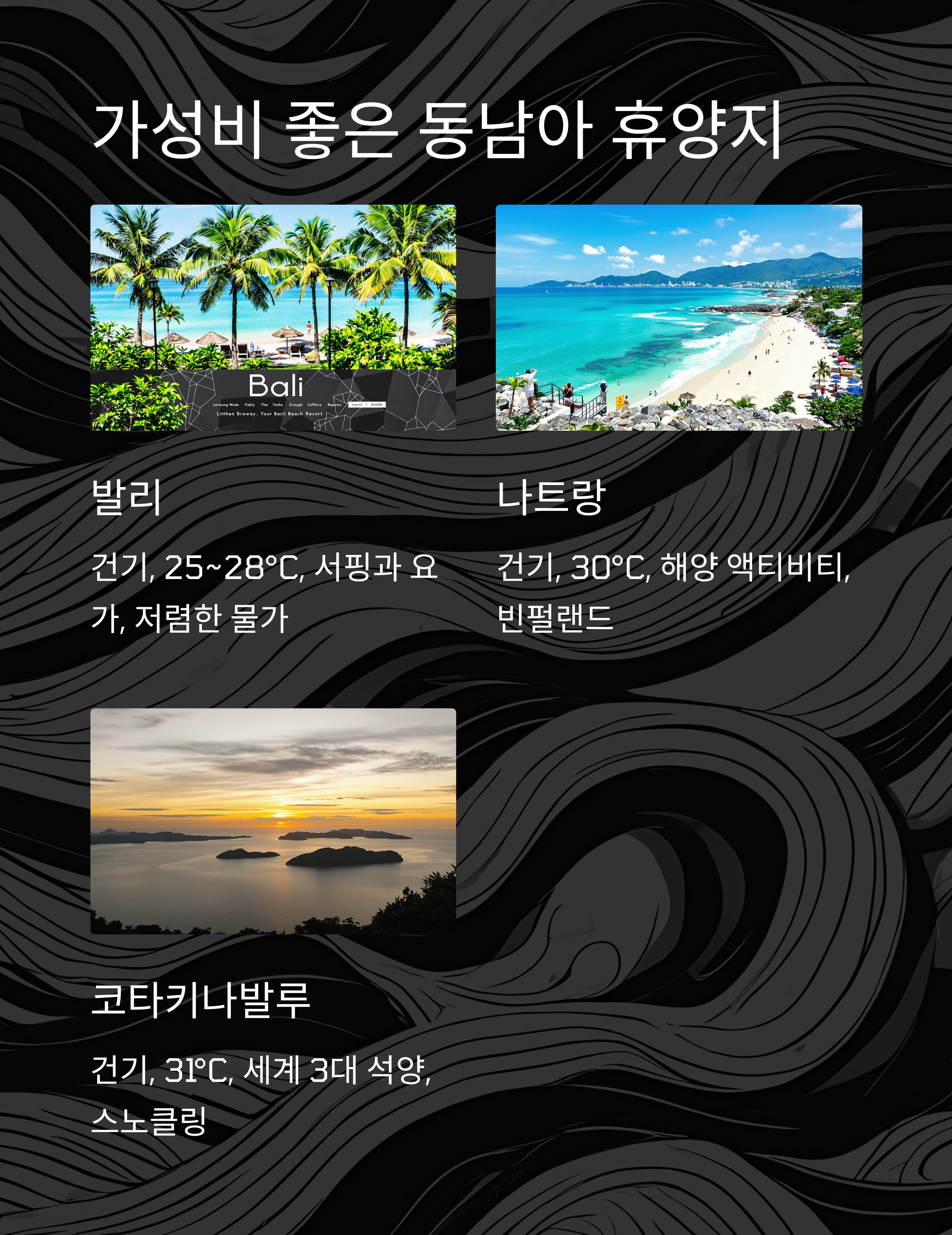 동남아시아는 8월이 건기인 곳들이 많아서 비 걱정 없이 맑은 날씨에 휴양을 즐길 수 있다는 장점이 있어요. 인도네시아 발리, 말레이시아 코타키나발루, 베트남 나트랑 등이 대표적인 8월 건기 여행지죠. 이곳들은 한국보다 저렴한 물가로 가성비 좋은 여행을 즐길 수 있어 더욱 매력적이에요.