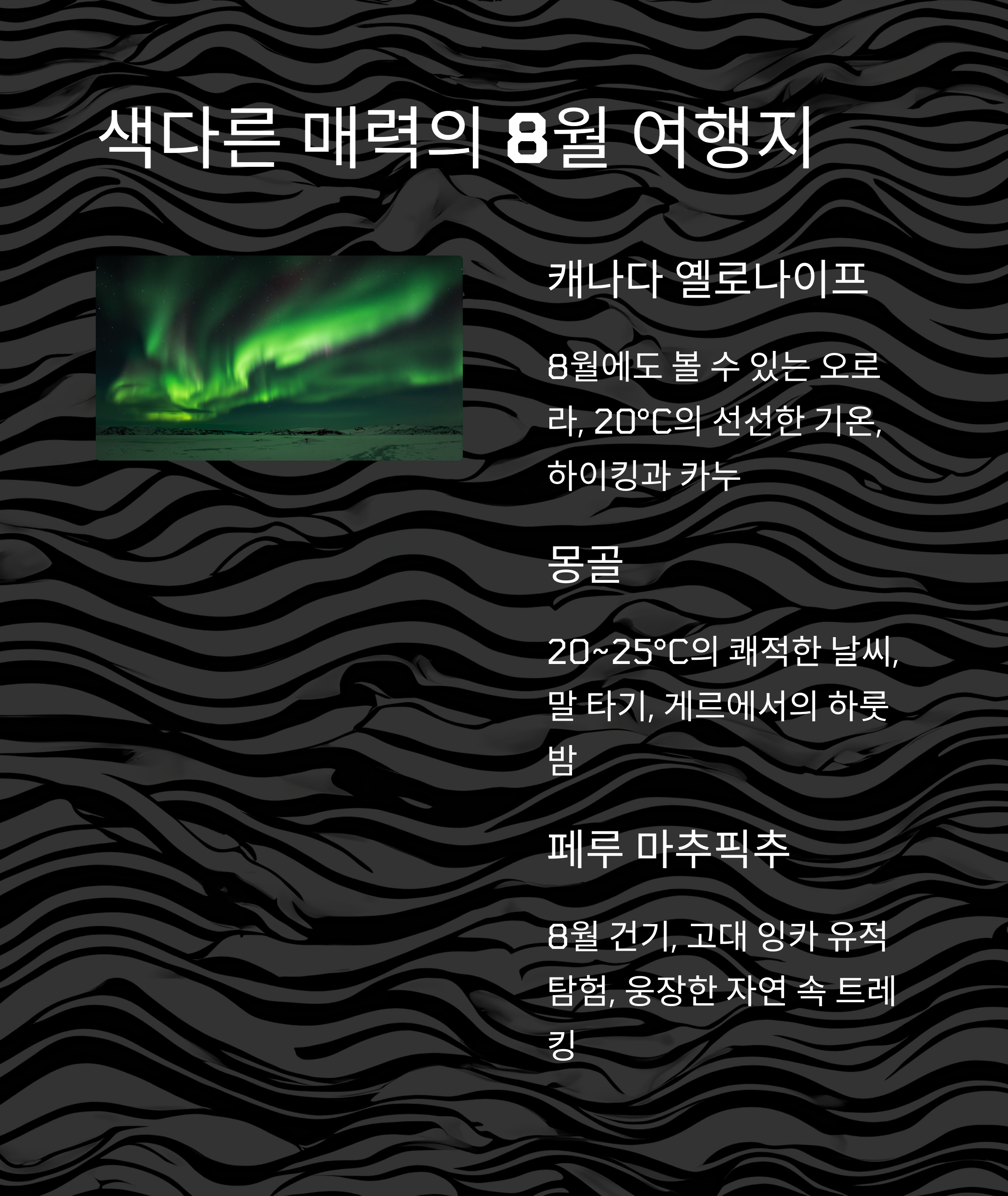 이 외에도 색다른 경험을 원한다면 캐나다 옐로나이프에서 여름 오로라를 보거나, 몽골의 드넓은 초원에서 나담 축제를 즐기는 것도 특별한 8월 휴가가 될 수 있답니다.