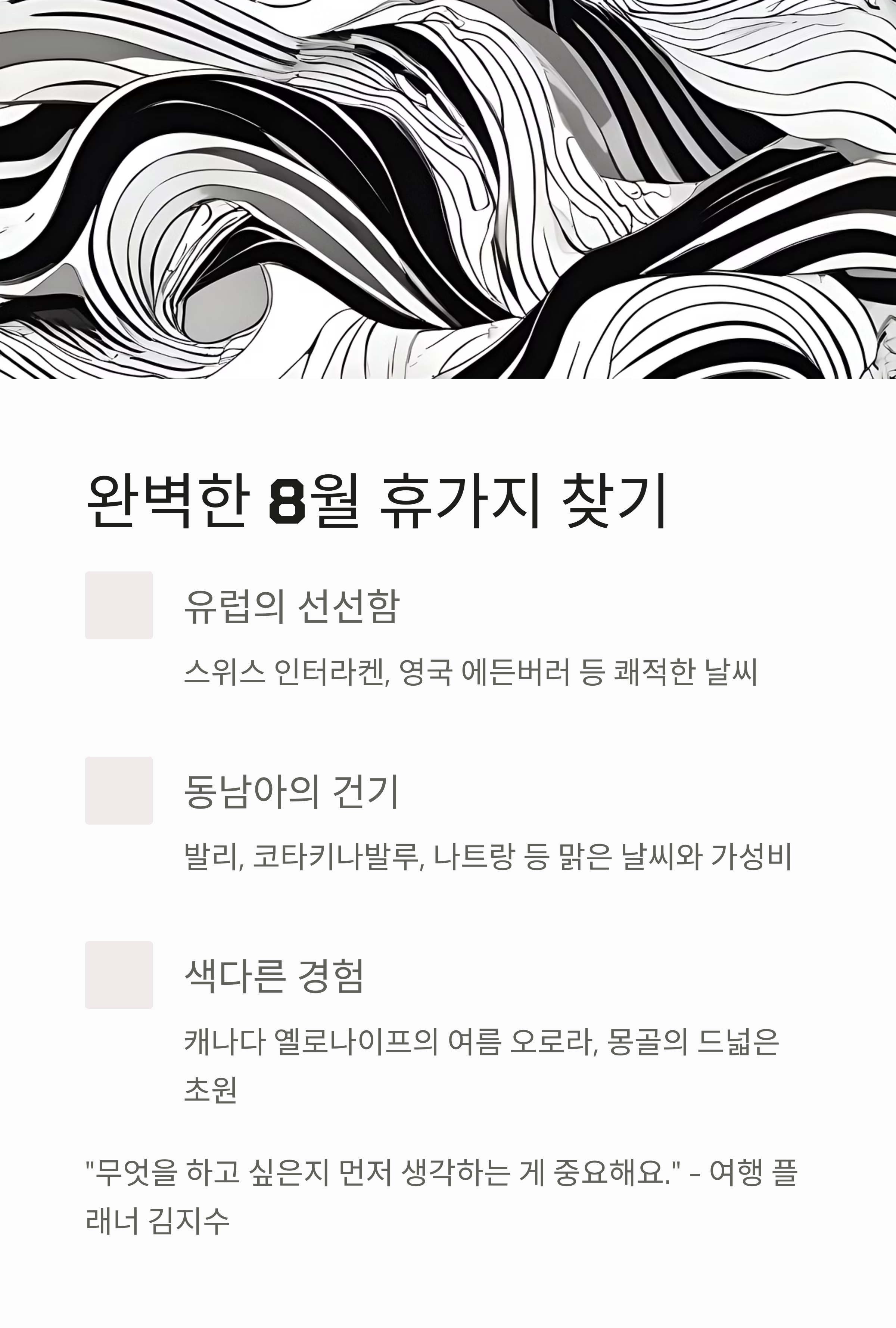 "8월 해외여행지를 고를 때는 '무엇을 하고 싶은지'를 먼저 생각하는 게 중요해요. 시원한 산에서 하이킹을 하고 싶은지, 에메랄드빛 바다에서 수영을 하고 싶은지, 아니면 이색적인 문화 체험을 하고 싶은지에 따라 추천 여행지가 확 달라지거든요. 본인의 취향을 정확히 파악하면 훨씬 만족스러운 여행을 할 수 있을 거예요!" - 여행 플래너 김지수