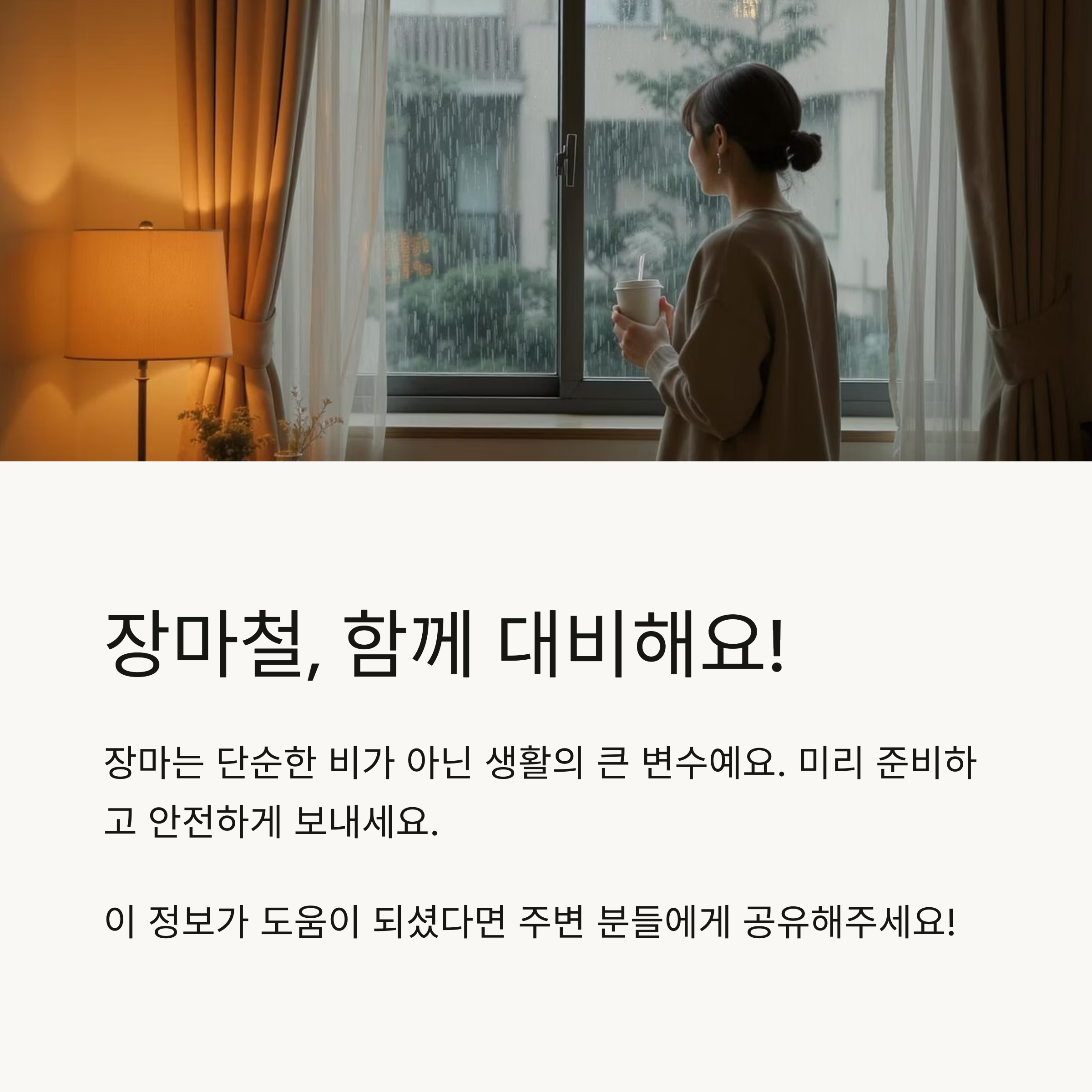 장마철을 건강하고 안전하게 보내기 위해선 생활 속 작은 준비가 정말 중요해요. 아래에 소개하는 꿀팁들은 실제로 제가 직접 써본 방법들이에요. 집안, 외출, 건강, 의류 관리까지 전방위로 챙기면 장마철도 거뜬하답니다.