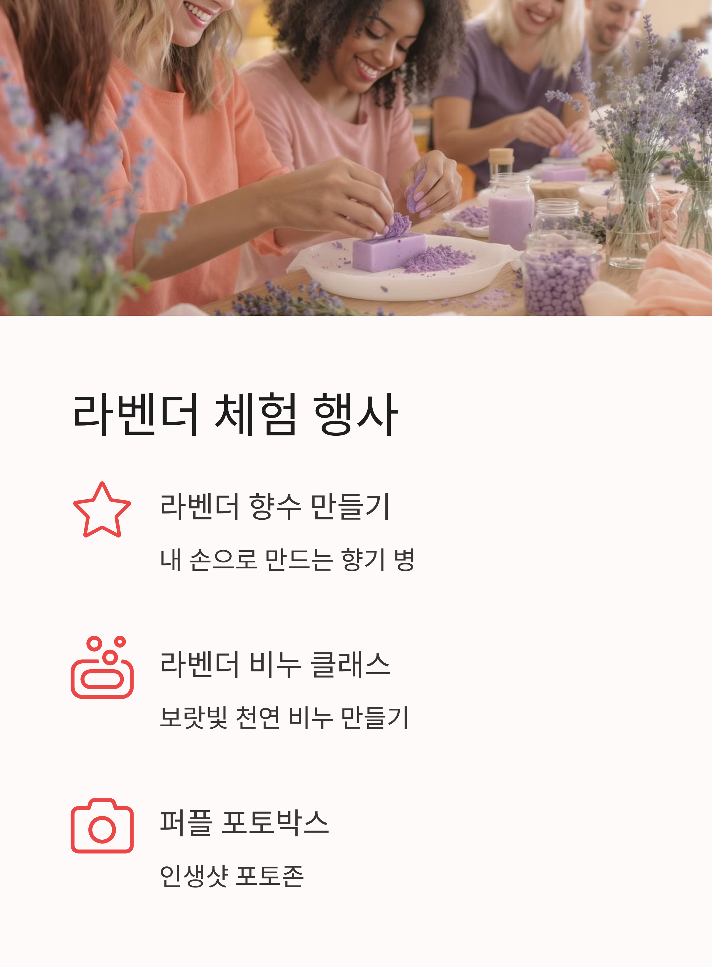 | 라벤더 꽃밭 보물찾기 | 꽃밭 속 보물을 찾아 상품 증정 | 어린이, 가족 |