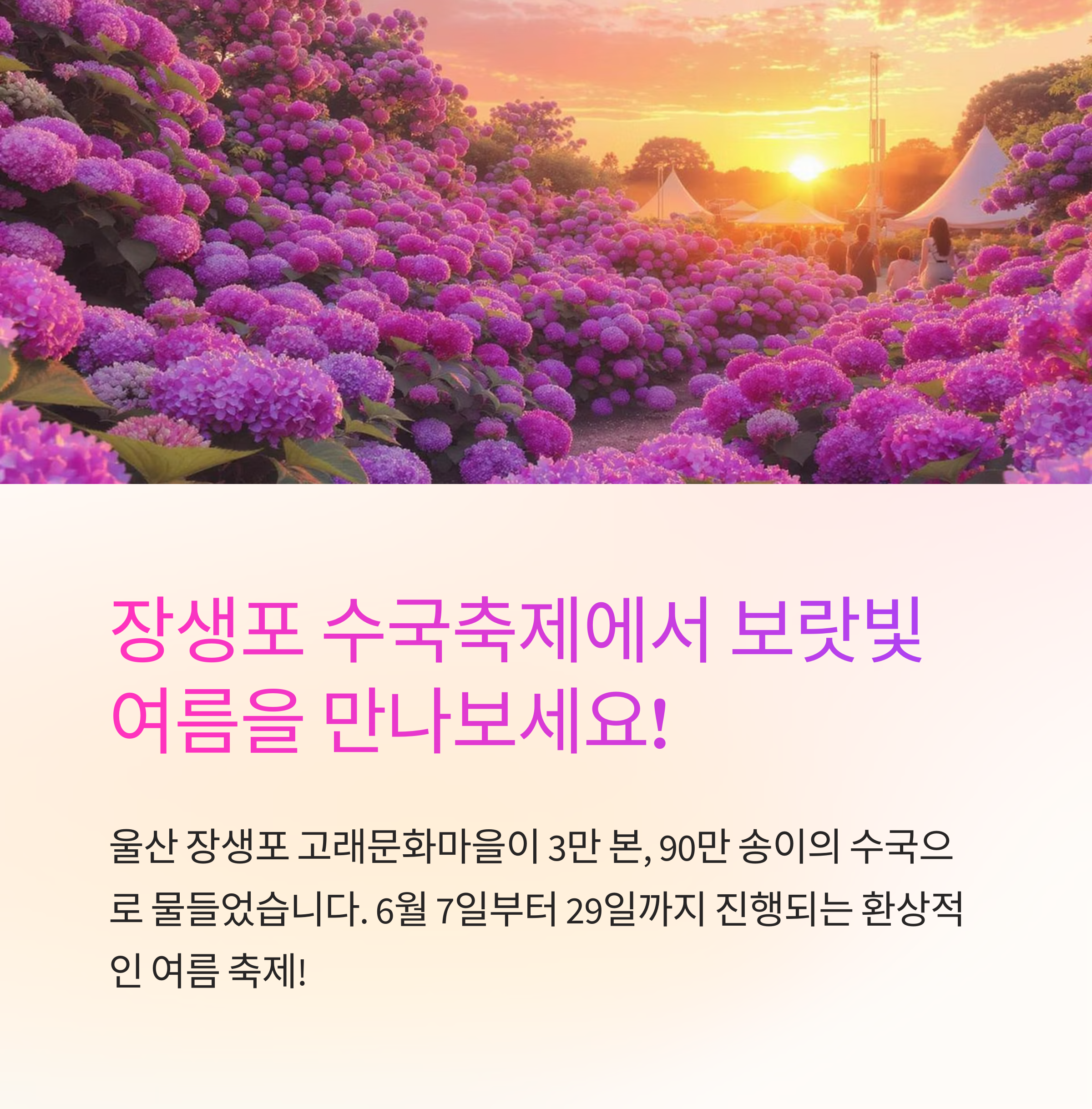 울산의 대표 여름 축제인 장생포 수국축제는 2025년 6월 7일부터 6월 29일까지, 총 23일간 진행돼요. 장소는 울산 남구 장생포 고래문화마을 일대로, 고래박물관과 해양체험관 등이 있는 복합 문화 공간이에요.