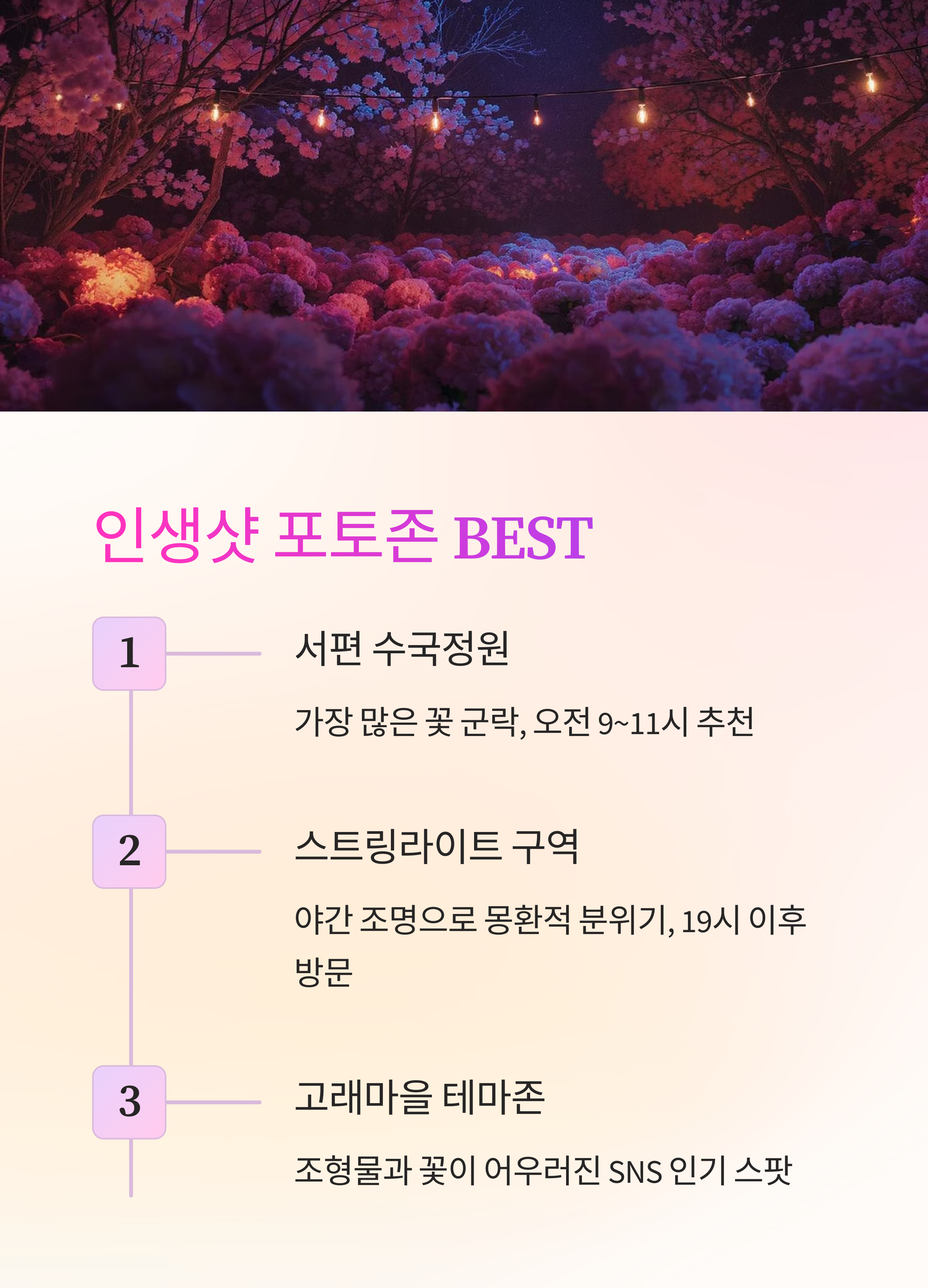 | 서편 수국정원 | 가장 많은 꽃 군락, 산책로 중심 | 오전 9~11시 |