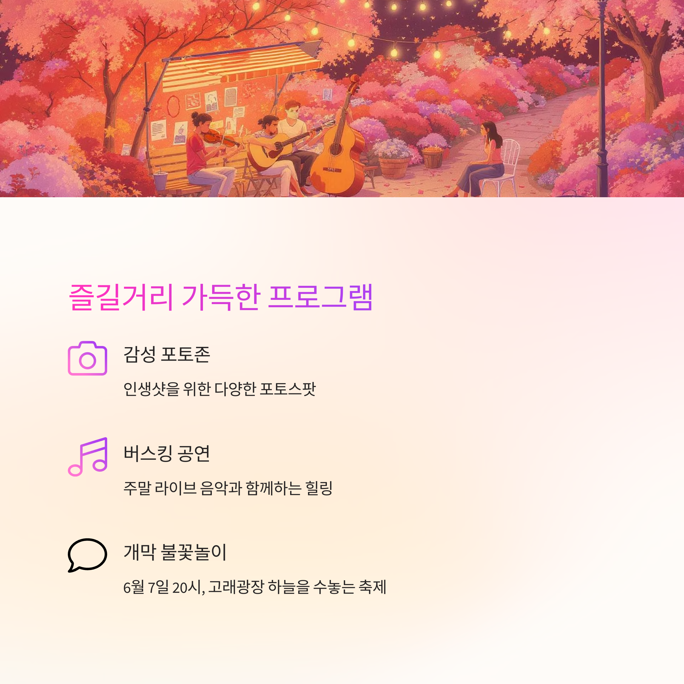 포토미션 이벤트는 지정된 포인트에서 사진을 찍고 SNS에 인증하면 기념품을 받을 수 있는 체험이에요. 주말에는 라이브 버스킹 공연도 열려서 감미로운 음악 속에서 꽃을 감상할 수 있답니다.