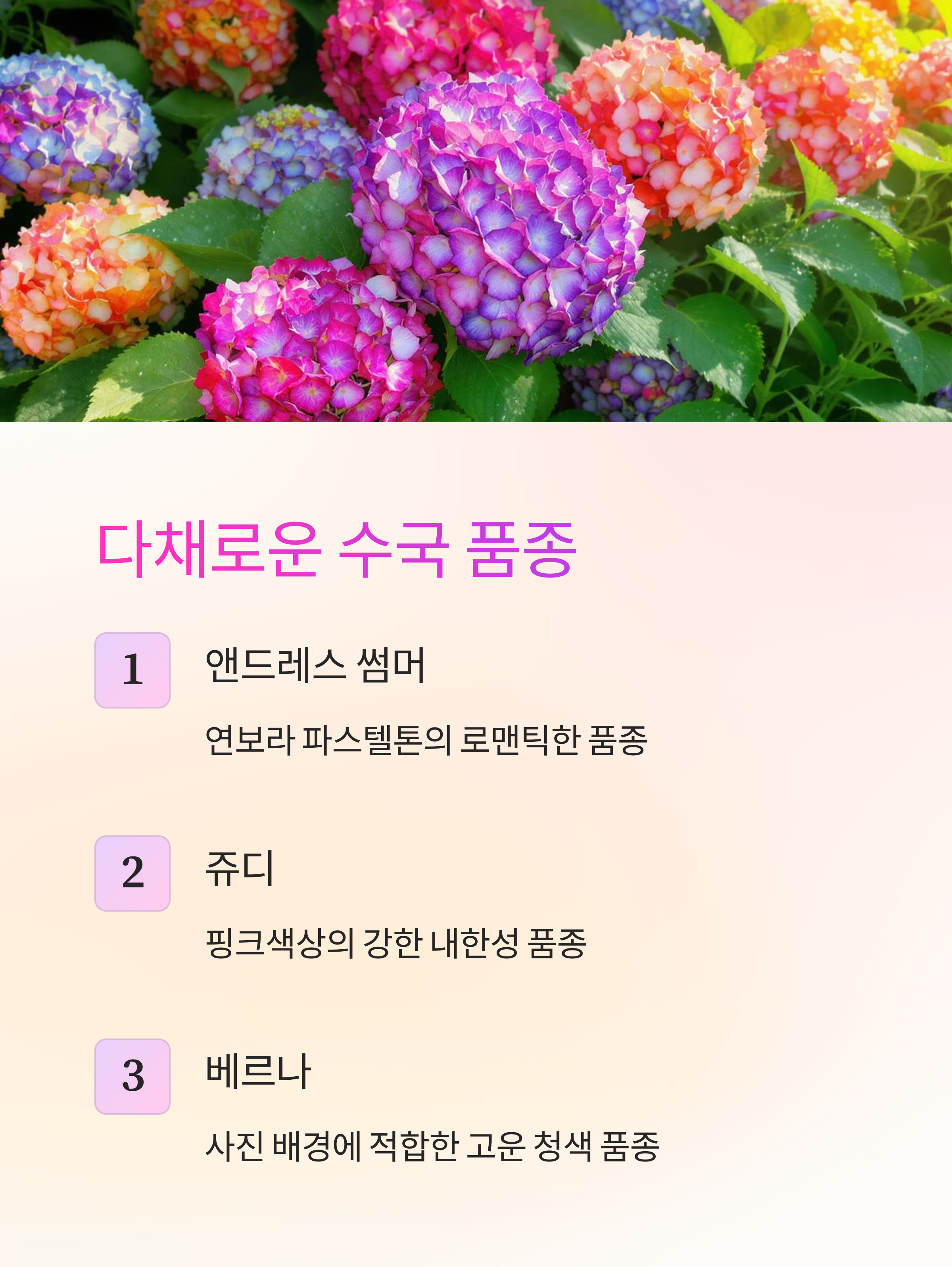 이번 장생포 수국 페스티벌에서 볼 수 있는 수국은 총 40여 품종에 달해요. 대표적인 품종으로는 앤드레스 썸머, 쥬디, 베르나 등이 있고, 색상도 연보라, 핑크, 푸른색까지 다양하답니다.