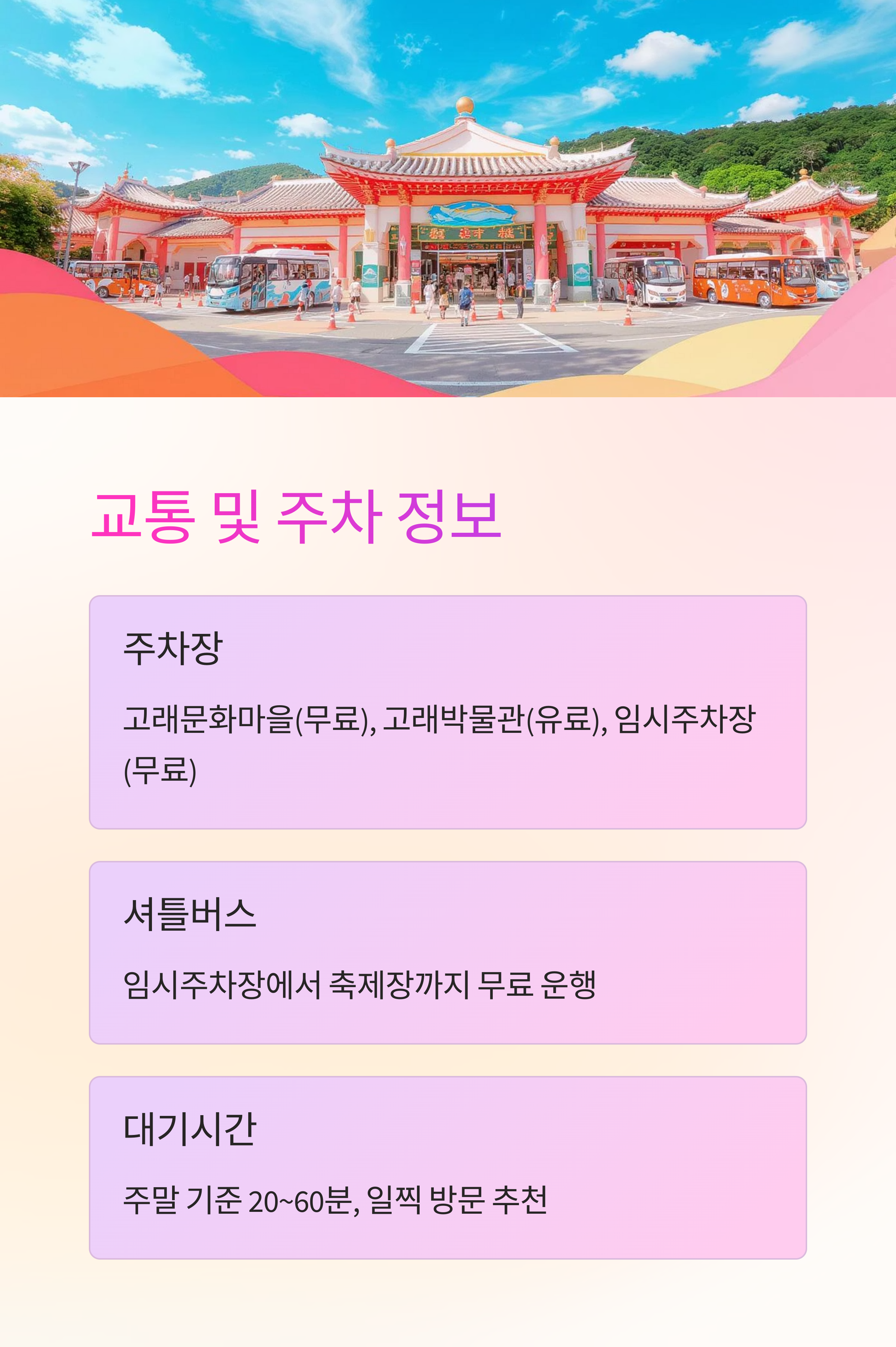 축제 기간에는 무료 셔틀버스도 운영돼요. 임시 주차장에서 축제장 입구까지 순환 운행되며, 대기 시간은 주말 기준 20~60분 정도예요.