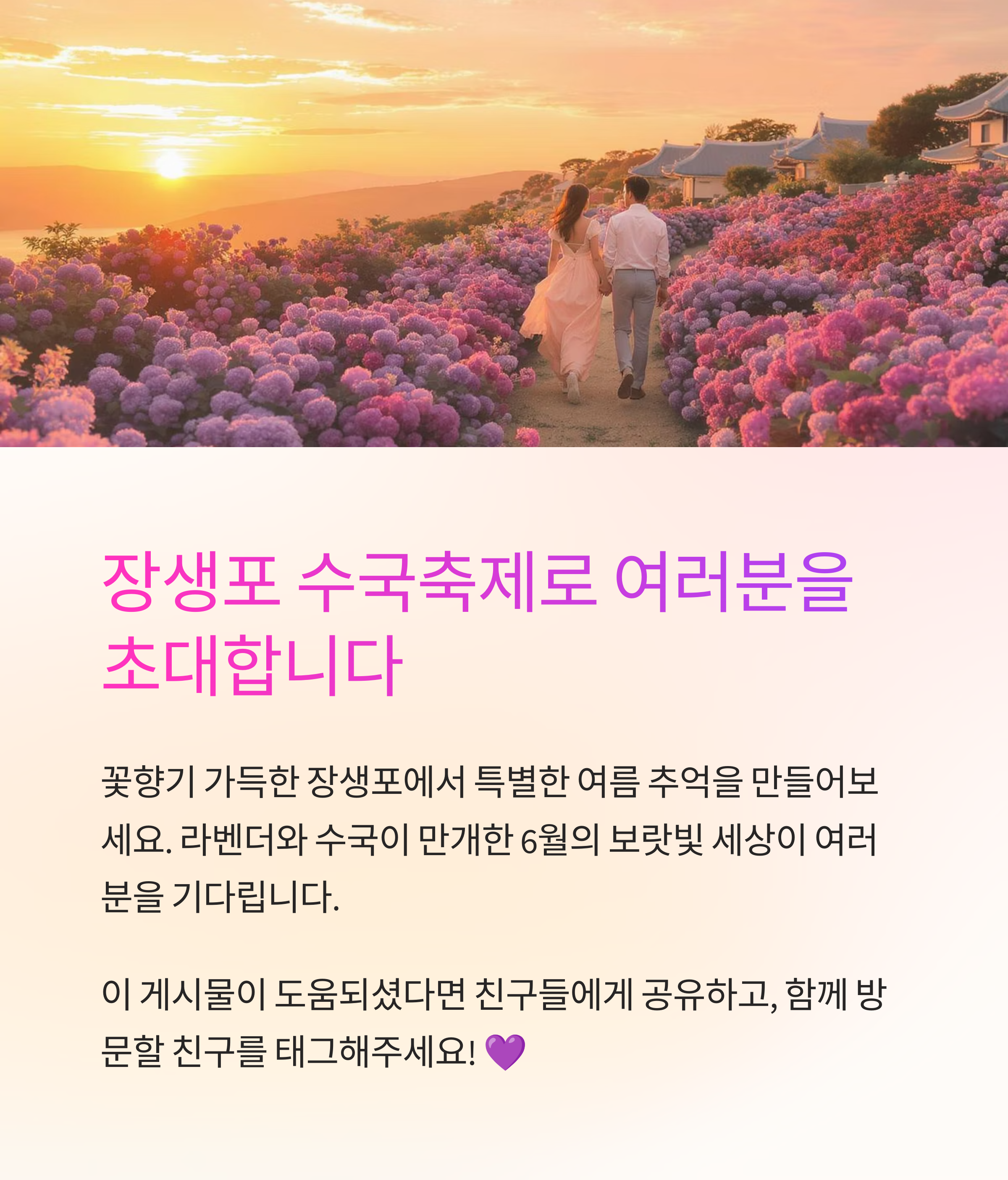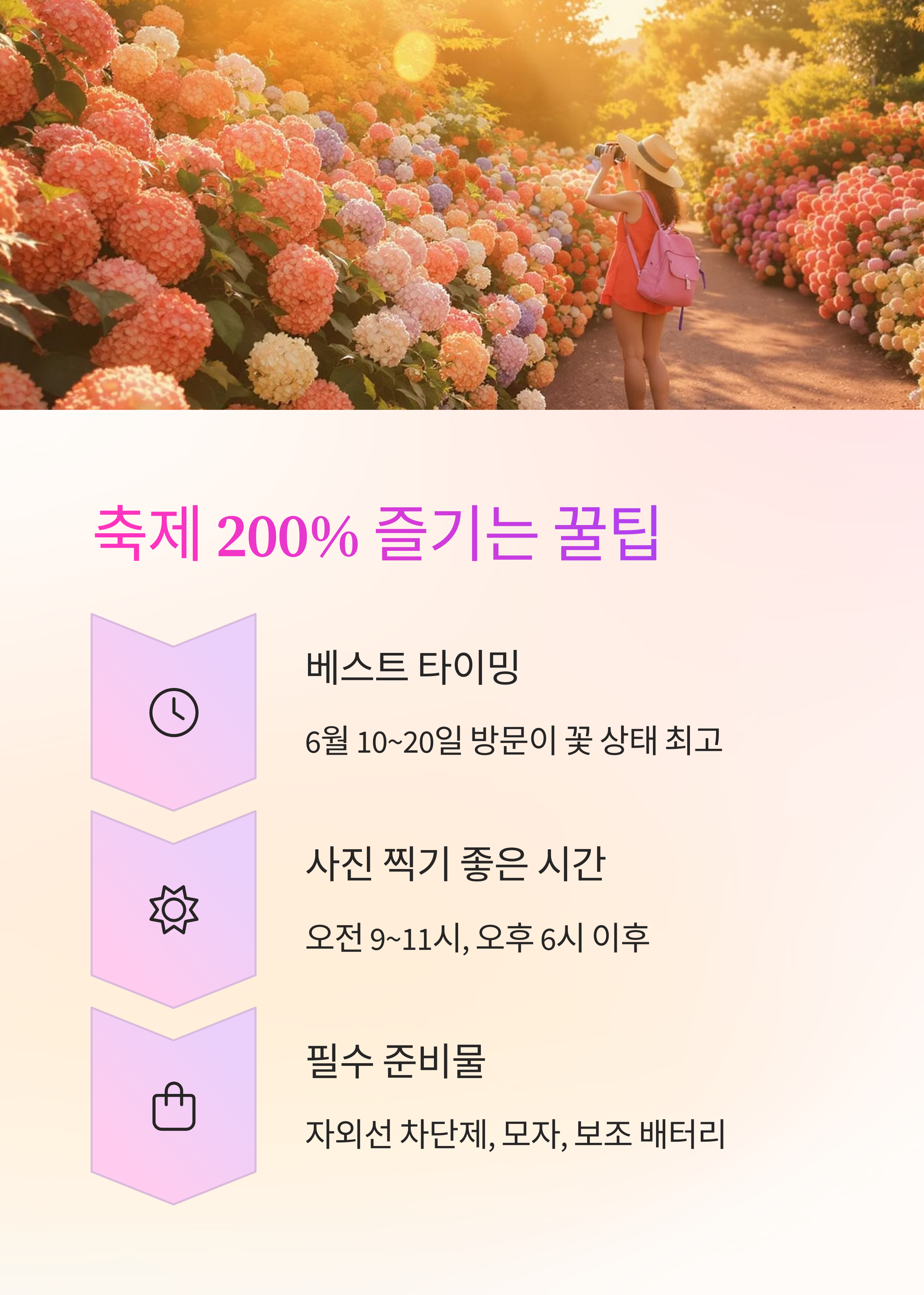 “수국도 예뻤지만, 저녁에 들었던 버스킹이 너무 좋았어요. 꽃향기 속에서 라이브 음악을 듣는 기분이 정말 힐링 그 자체였죠.” - 2024년 관람객 후기