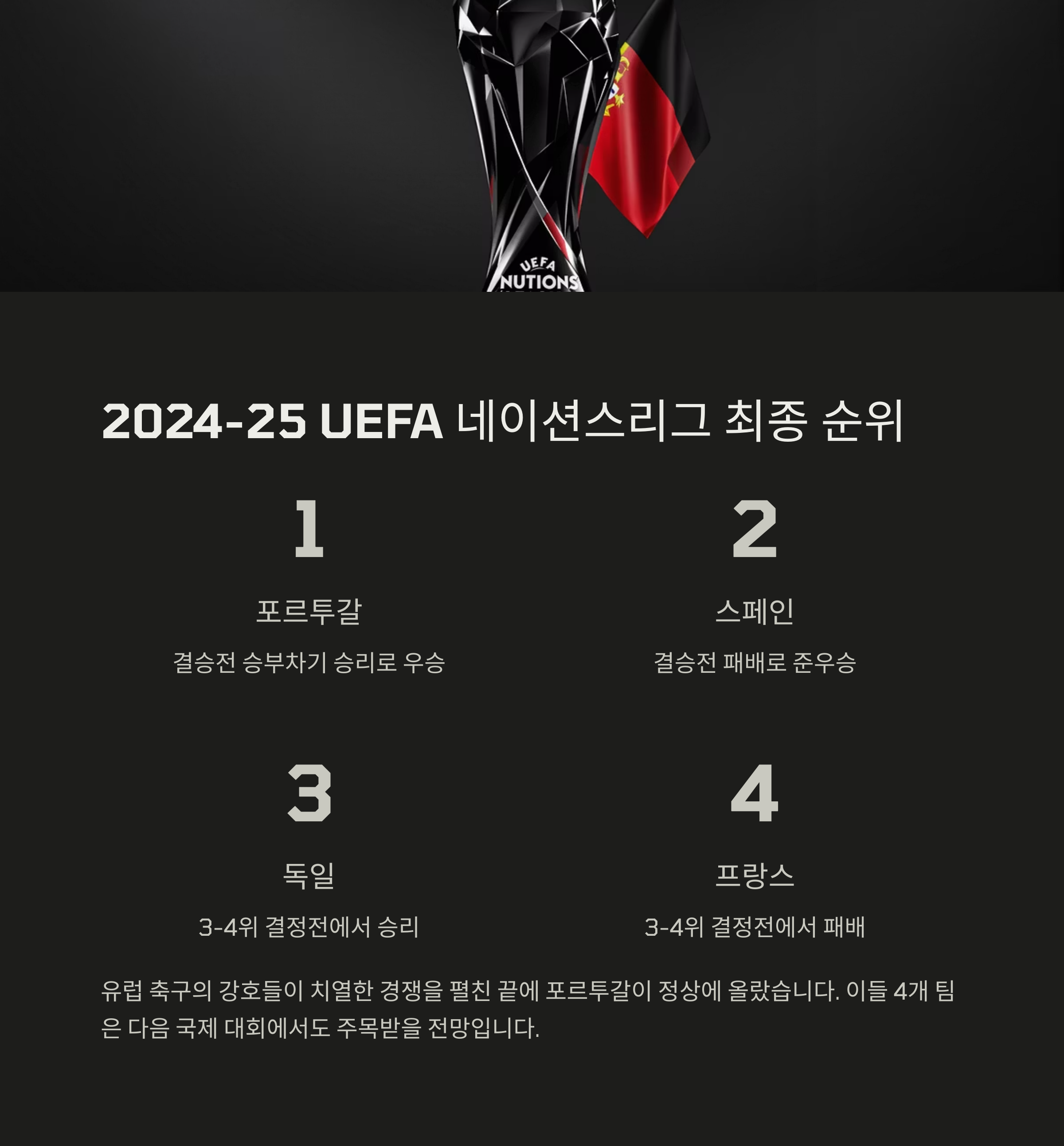 2025년 UEFA 네이션스리그는 많은 기록과 명장면을 남기며 성공적으로 마무리되었습니다. 2025 네이션스리그 우승상금의 주인이 된 포르투갈과 모든 참가팀들에게 박수를 보냅니다. 앞으로도 축구의 뜨거운 열정이 계속되기를 기대합니다!