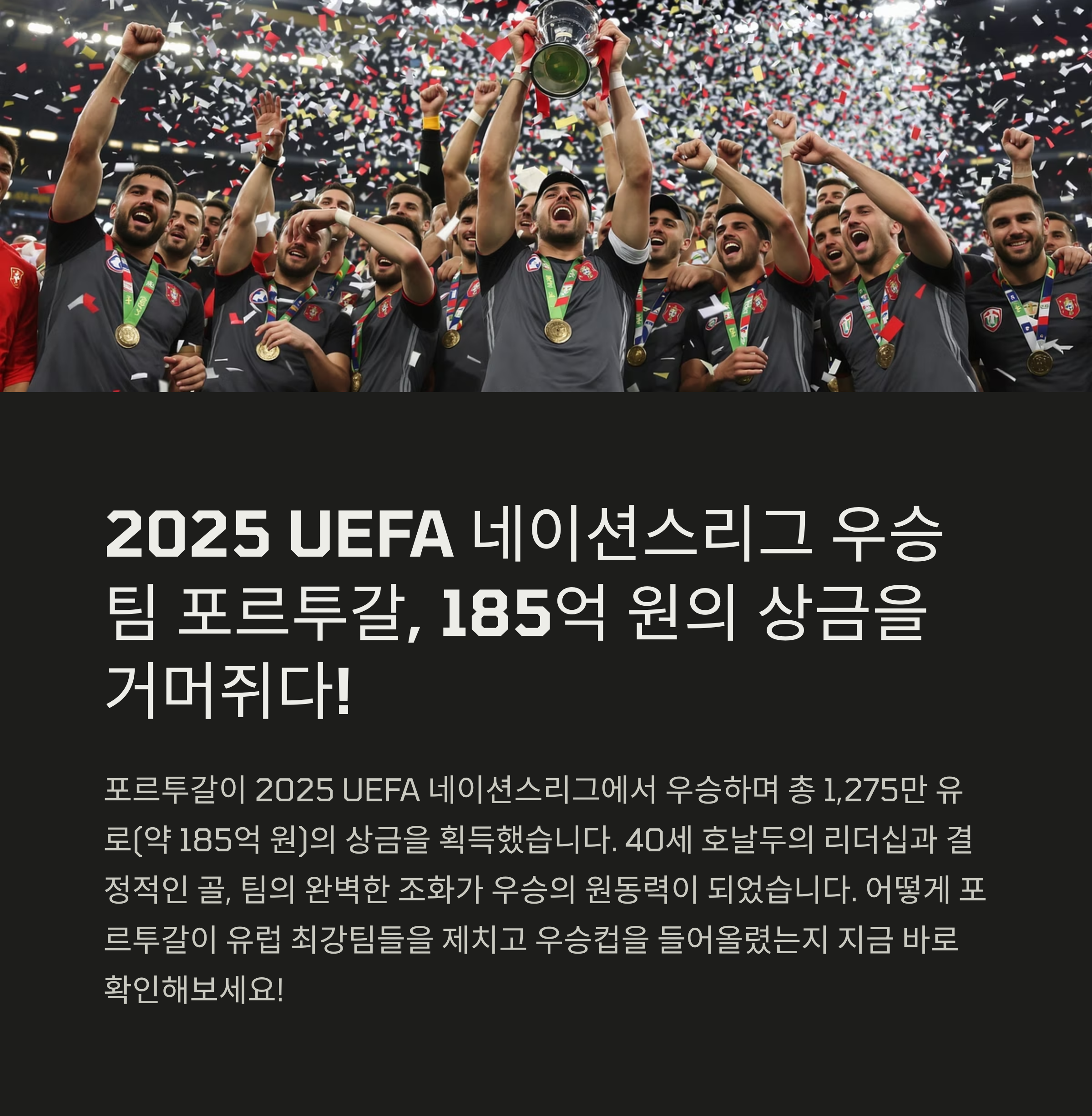 2025 UEFA 네이션스리그 우승상금 185억, 포르투갈이 거머쥔 이유를 분석합니다. 크리스티아누 호날두의 리더십, 우승팀 순위, 다시 보기 정보까지! 챔피언 포르투갈의 모든 것을 알아보세요.