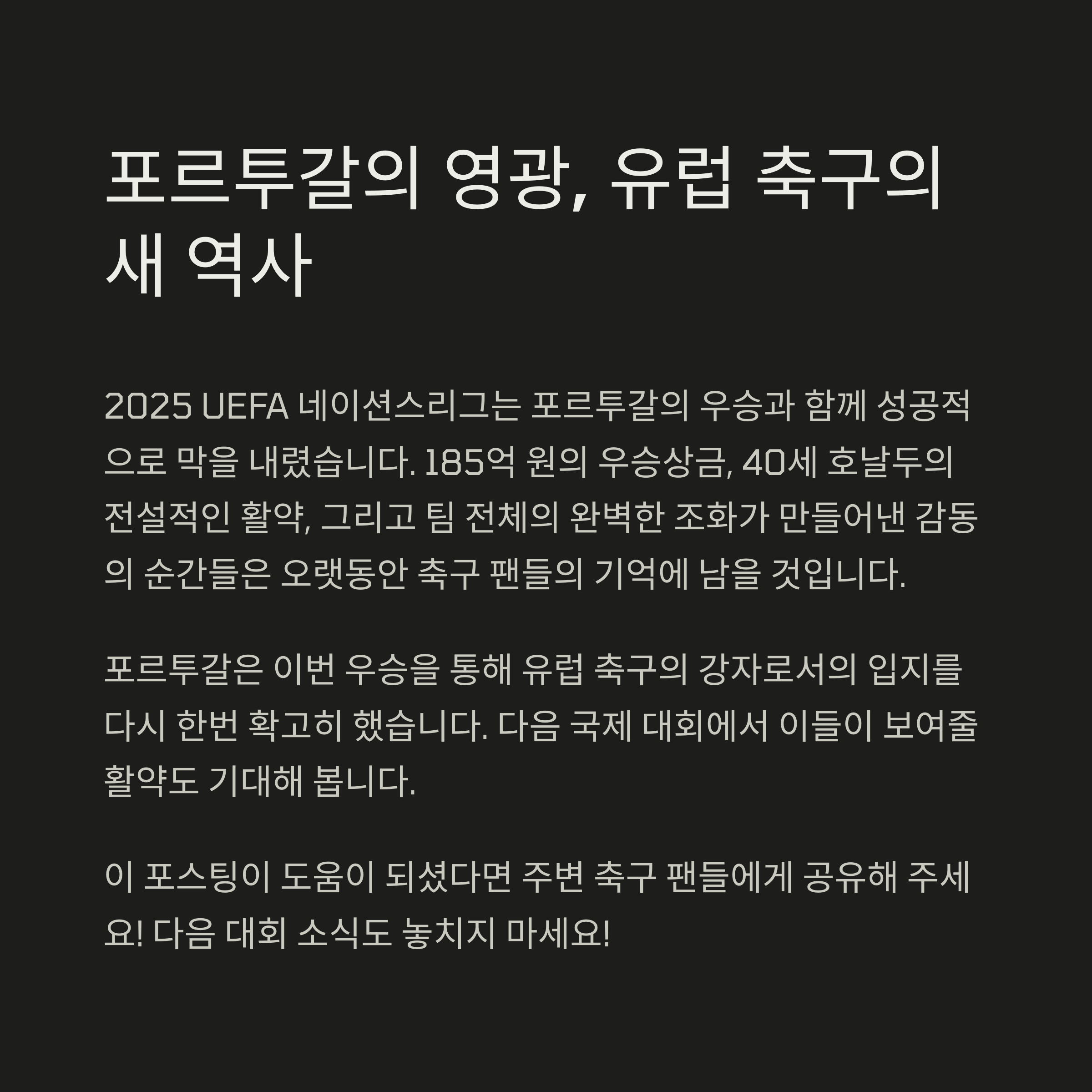 2025년 UEFA 네이션스리그는 많은 기록과 명장면을 남기며 성공적으로 마무리되었습니다. 2025 네이션스리그 우승상금의 주인이 된 포르투갈과 모든 참가팀들에게 박수를 보냅니다. 앞으로도 축구의 뜨거운 열정이 계속되기를 기대합니다!