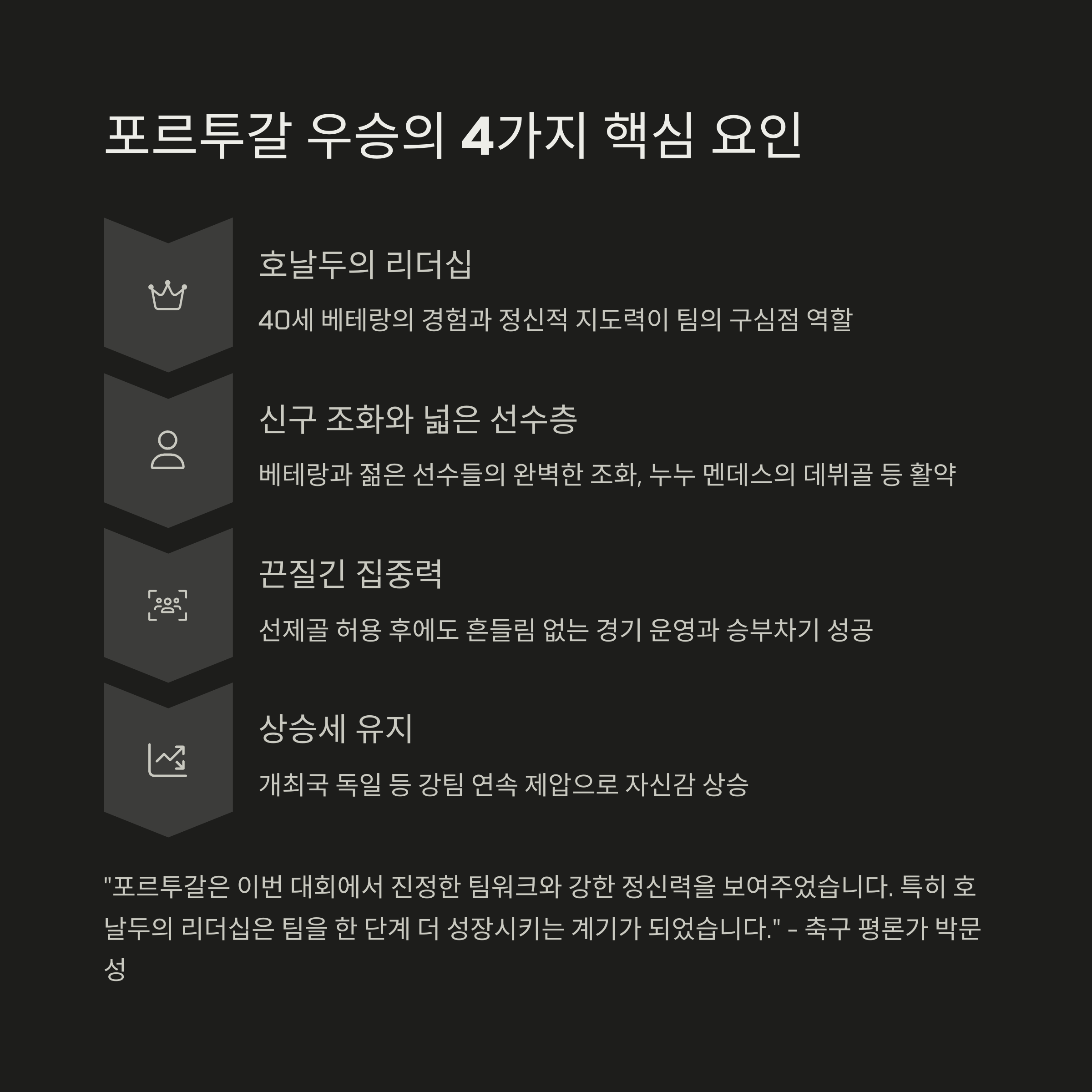 "포르투갈은 이번 대회에서 진정한 팀워크와 강한 정신력을 보여주었습니다. 특히 호날두의 리더십은 팀을 한 단계 더 성장시키는 계기가 되었습니다." - 축구 평론가 박문성