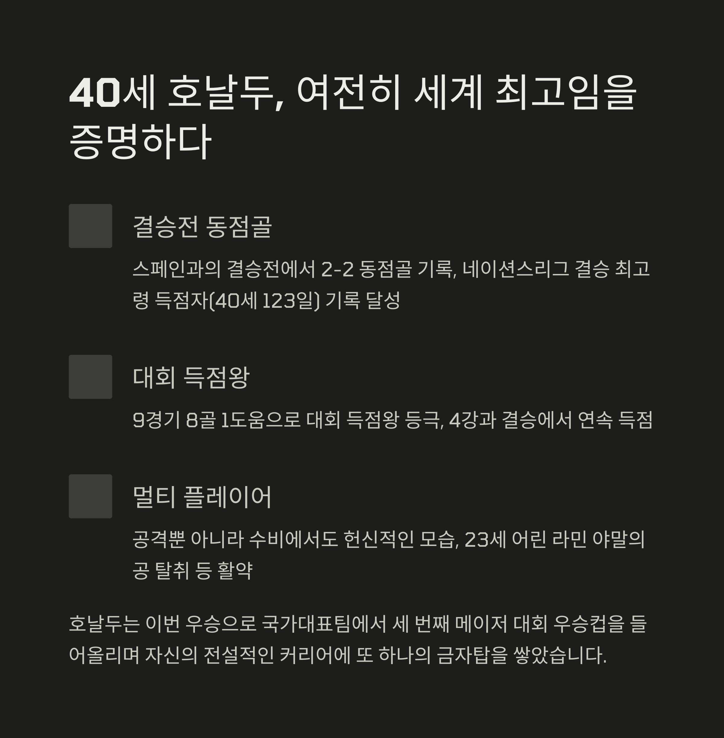 포르투갈의 주장 크리스티아누 호날두는 40세라는 나이에도 불구하고 뛰어난 경기력과 정신력을 보여주며 팀의 구심점 역할을 했습니다. 그는 결승전에서 팀을 이끌며 위기의 순간마다 중심을 잡아주었고, 팀 전체의 분위기를 끌어올리는 데 결정적인 역할을 했습니다. 이번 우승으로 호날두는 국가대표에서 세 번째 메이저 대회 우승컵을 들어 올리며, 여전히 세계 정상급 선수임을 다시 한번 입증했습니다.
