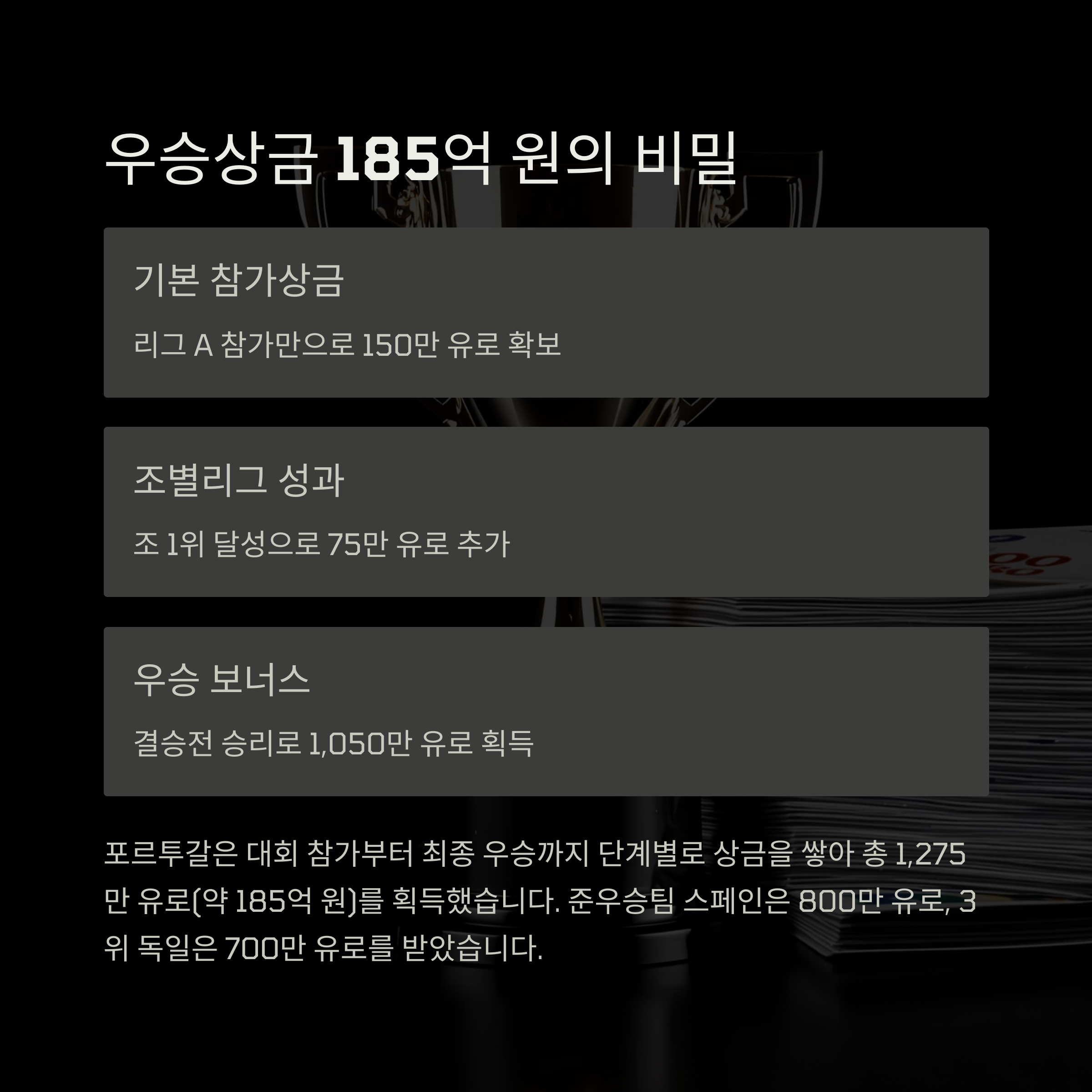 A1. 우승팀 포르투갈은 총 1,275만 유로(한화 약 185억 원 내외)의 상금을 받았습니다.