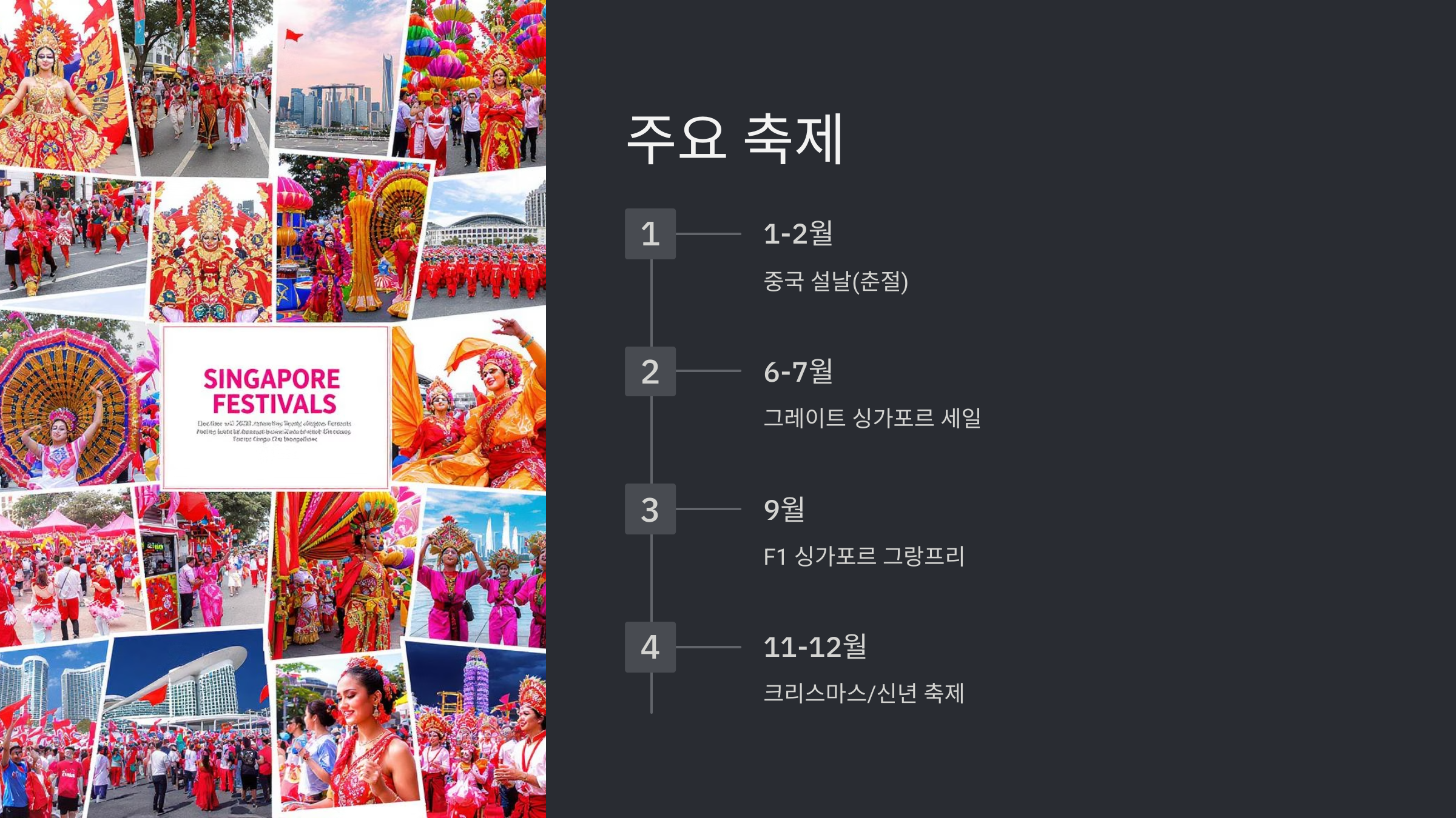 반대로 싱가포르에는 1년 내내 다채로운 축제와 이벤트가 열린답니다. 연말연시의 화려한 크리스마스 및 신년 축제, 1월~2월의 중국 설날, 6월~7월의 그레이트 싱가포르 세일 (GSS), 그리고 9월의 F1 싱가포르 그랑프리까지! 특정 축제를 즐기고 싶다면 해당 축제 시기에 맞춰 여행 일정을 잡는 것이 좋아요. 축제 기간에는 항공권과 숙박 요금이 비싸질 수 있지만, 그만큼 특별한 경험을 할 수 있을 거예요.
