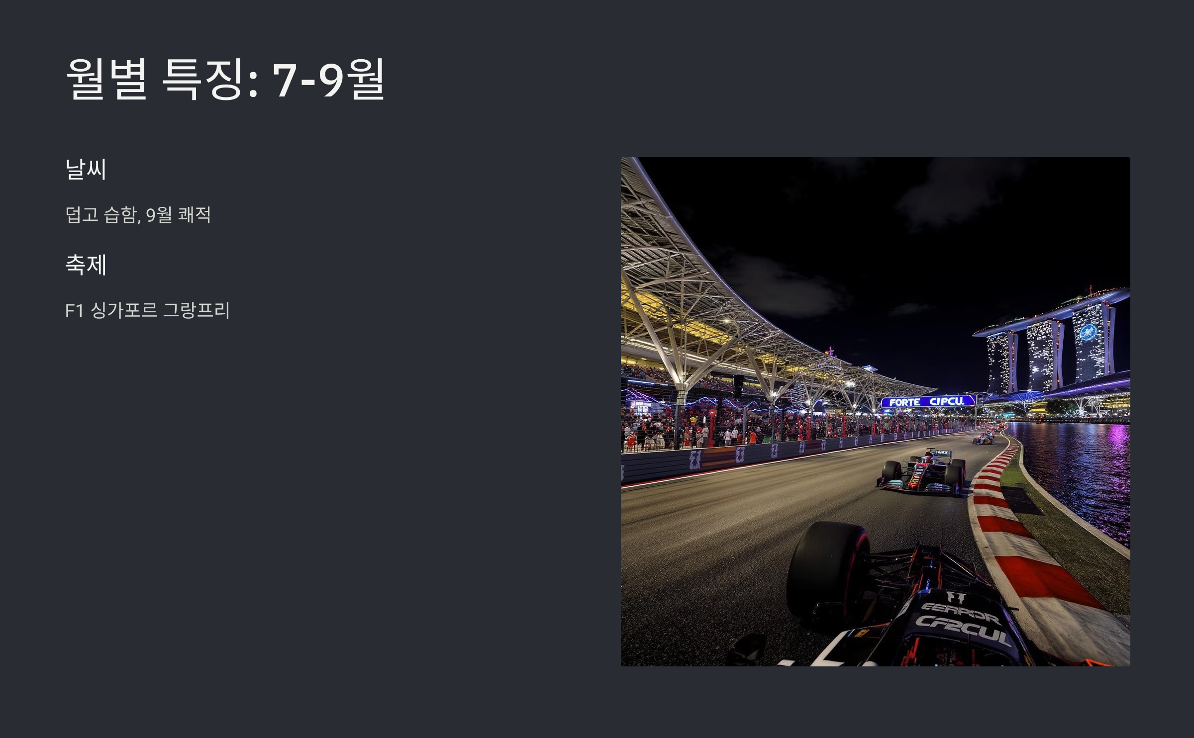 9월 - 10월 건기, 날씨 쾌적, F1 그랑프리 (9월), 헤이즈 가능성 F1 관람, 도시 탐험, 문화 행사, 루프탑 바에서 야경 감상