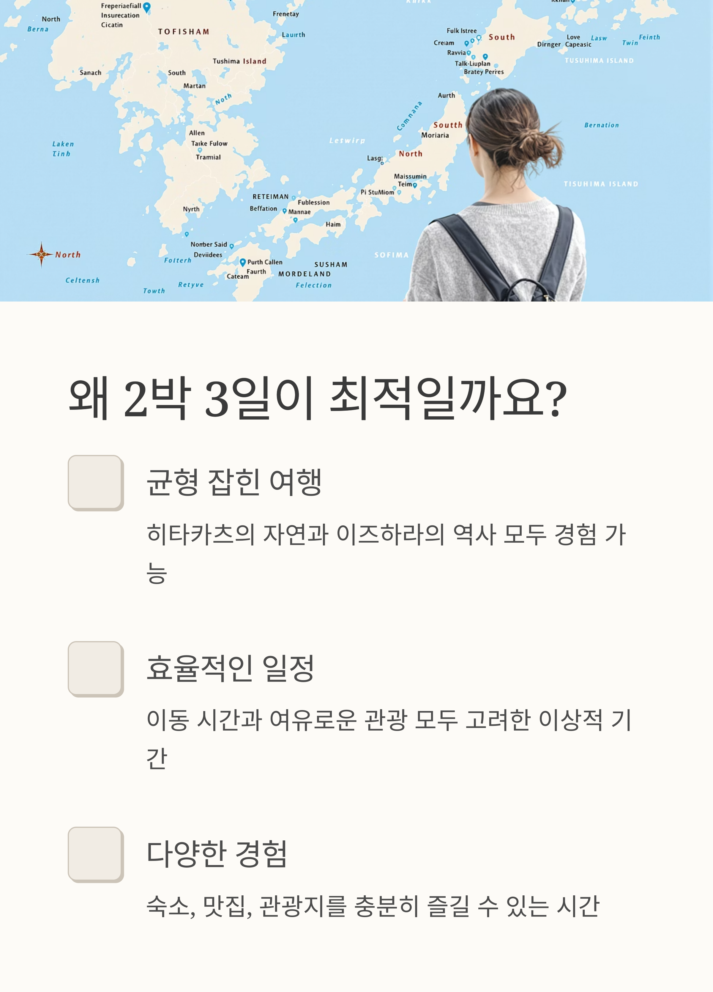 성공적인 대마도 여행 2박 3일을 위해서는 효율적인 동선 계획이 필수입니다. 보통 부산에서 배를 타고 히타카츠 또는 이즈하라로 입국하게 되는데, 어디로 들어가고 나가는지에 따라 코스를 달리하는 것이 좋습니다. 여기서는 히타카츠 IN - 이즈하라 OUT을 기준으로 한 추천 코스를 제안합니다.