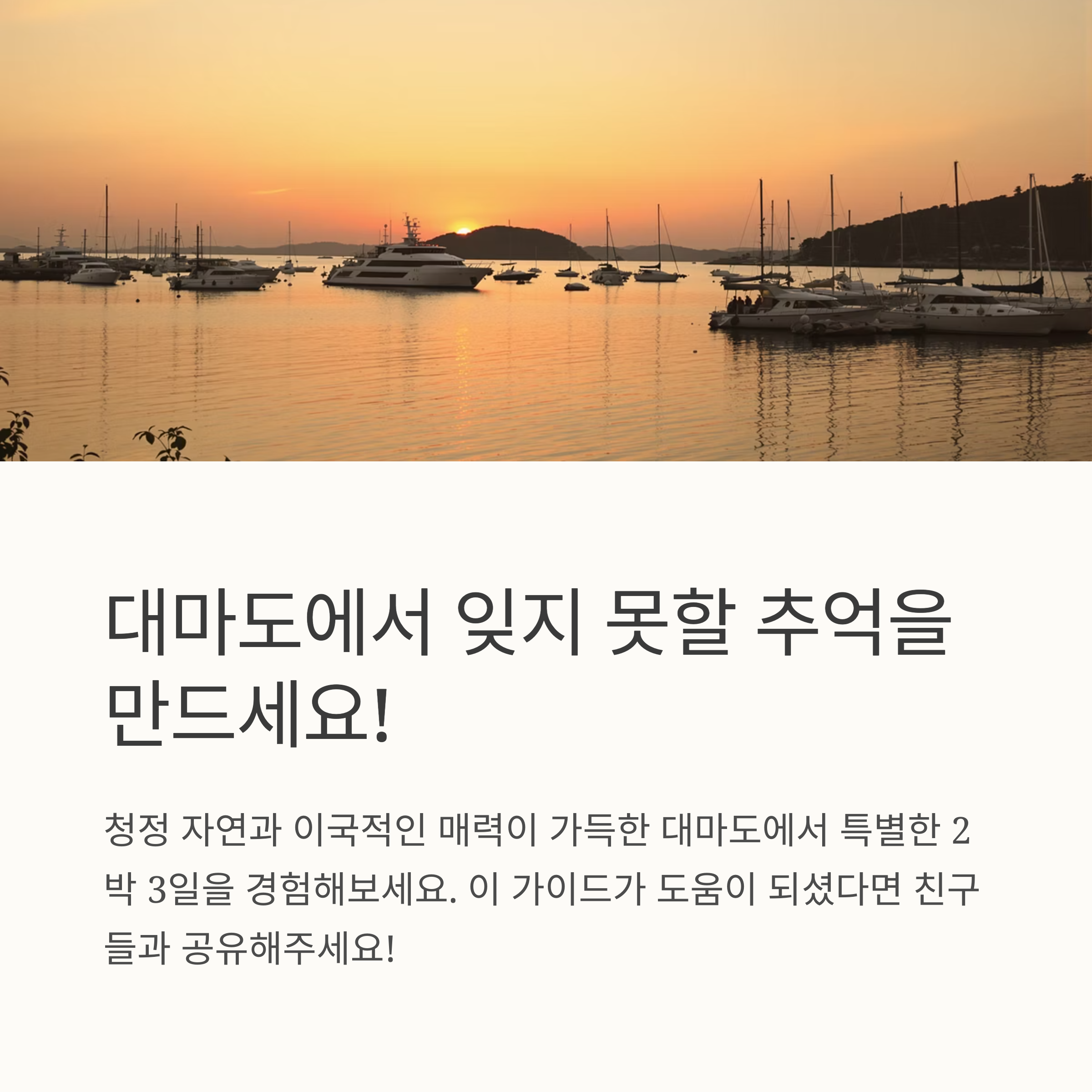 지금까지 대마도 여행 2박 3일을 위한 모든 정보를 상세하게 알려드렸습니다. 이 가이드를 통해 여러분의 대마도 여행이 더욱 즐겁고 완벽한 추억으로 가득하길 바랍니다. 청정 자연의 섬, 대마도에서 잊지 못할 시간을 보내세요!