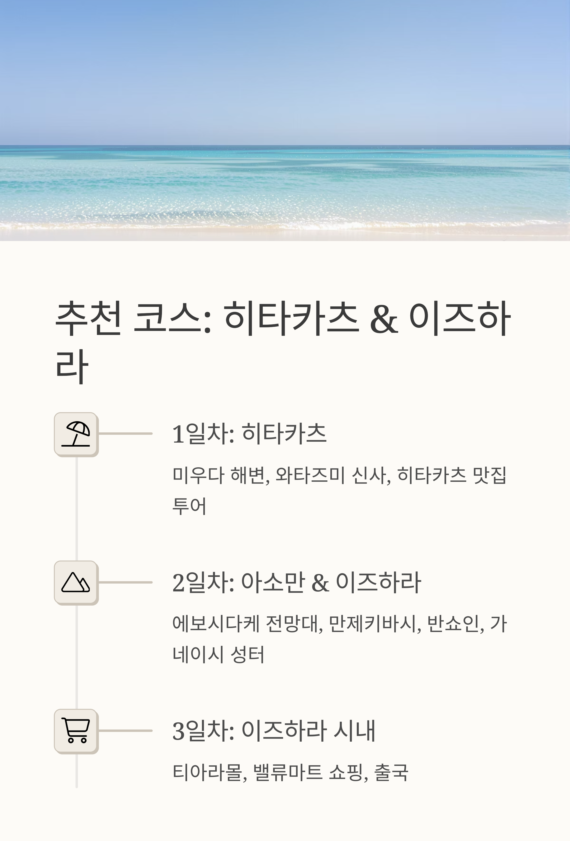 | 1일차 | 히타카츠 도착, 렌터카 대여, 미우다 해변 | 와타즈미 신사, 히타카츠 맛집 투어 | 히타카츠 숙소 체크인, 이자카야 |
