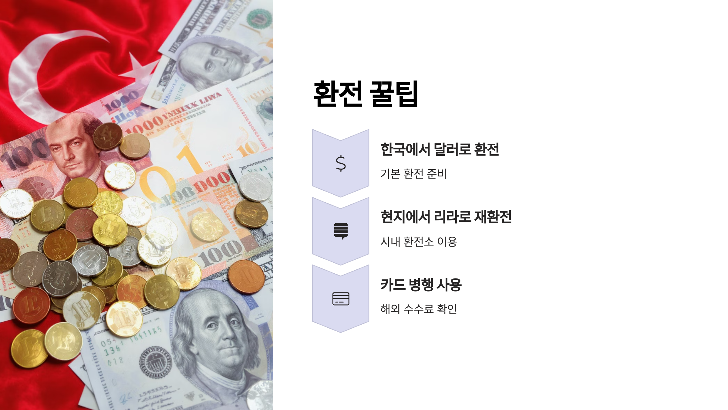 환전은 보통 한국에서 달러로 바꾼 후 튀르키예 현지에서 리라로 다시 바꾸는 이중 환전이 유리하다고 알려져 있어요. 한국에서 바로 리라로 환전하는 것보다 수수료가 저렴한 경우가 많기 때문이죠.