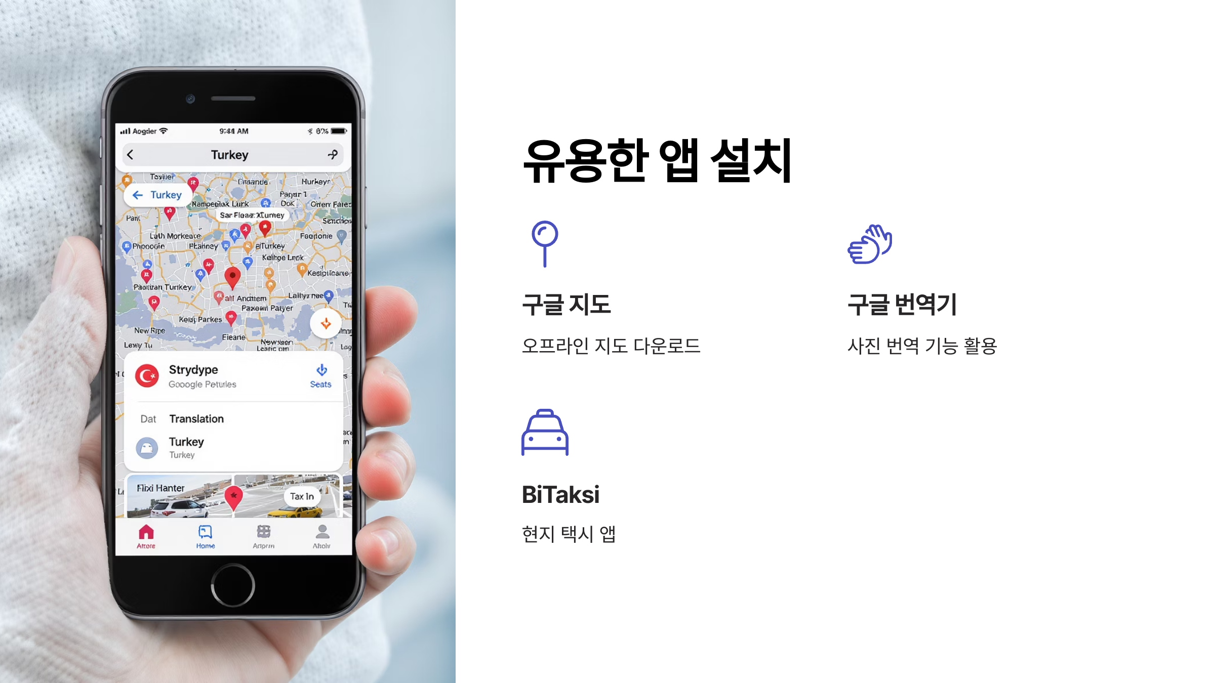현대인의 여행에서 스마트폰 앱은 이제 선택이 아닌 필수가 되었죠? 튀르키예 여행에서도 유용한 앱들을 잘 활용하면 훨씬 더 편리하고 스마트한 여행을 즐길 수 있어요. 길을 찾거나, 언어의 장벽을 넘거나, 심지어 맛집을 찾는 것까지! 튀르키예 여행 준비물 목록에 유용한 앱 설치도 꼭 포함시켜 주세요! 📱