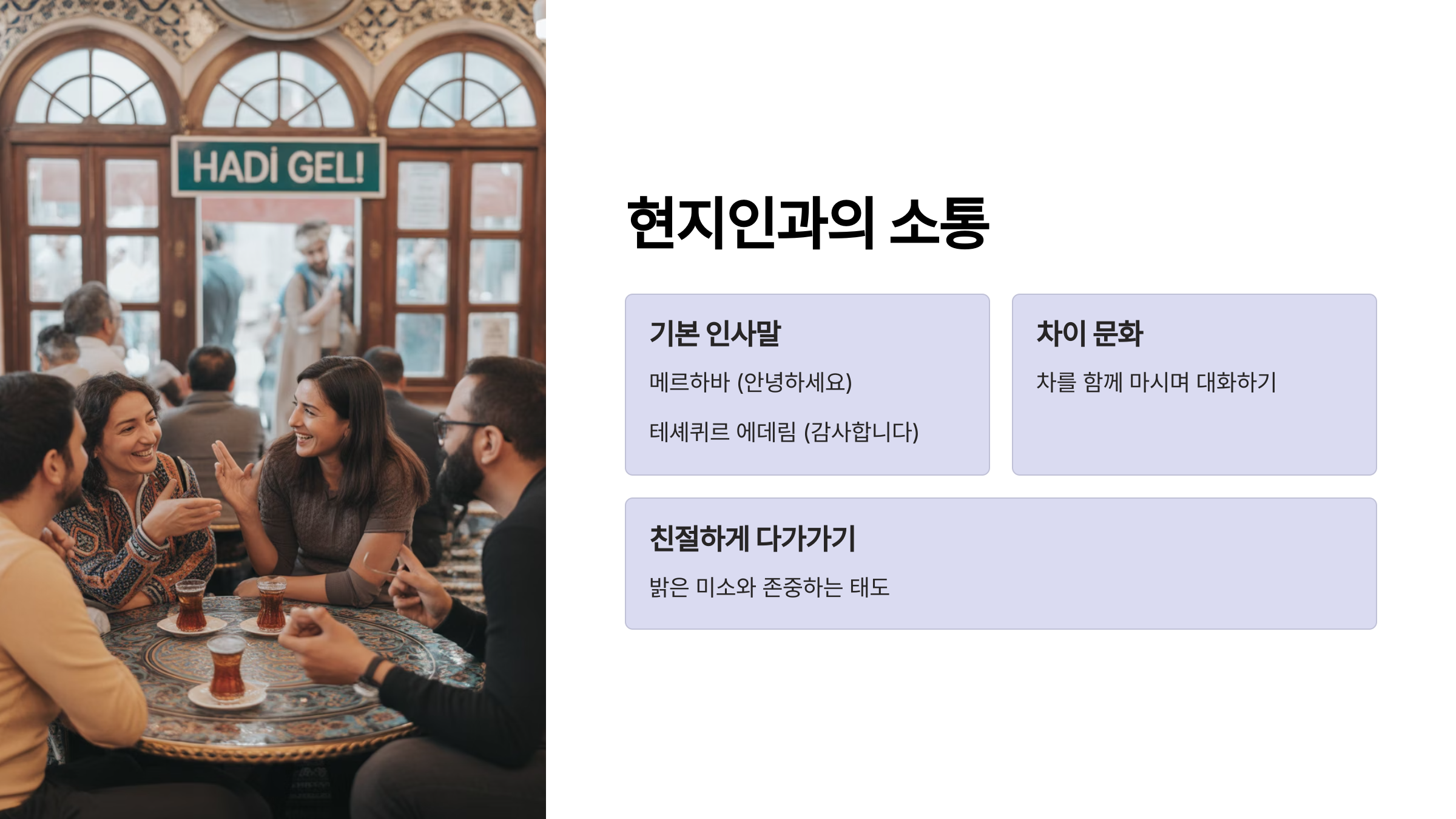 현지인들에게 간단한 터키어 인사말을 건네면 현지인들이 더욱 친근하게 느껴질 거예요. "메르하바(Merhaba - 안녕하세요)", "테셰퀴르 에데림(Teşekkür ederim - 감사합니다)", "귈레 귈레(Güle güle - 안녕히 가세요)" 정도만 알아두어도 충분합니다.