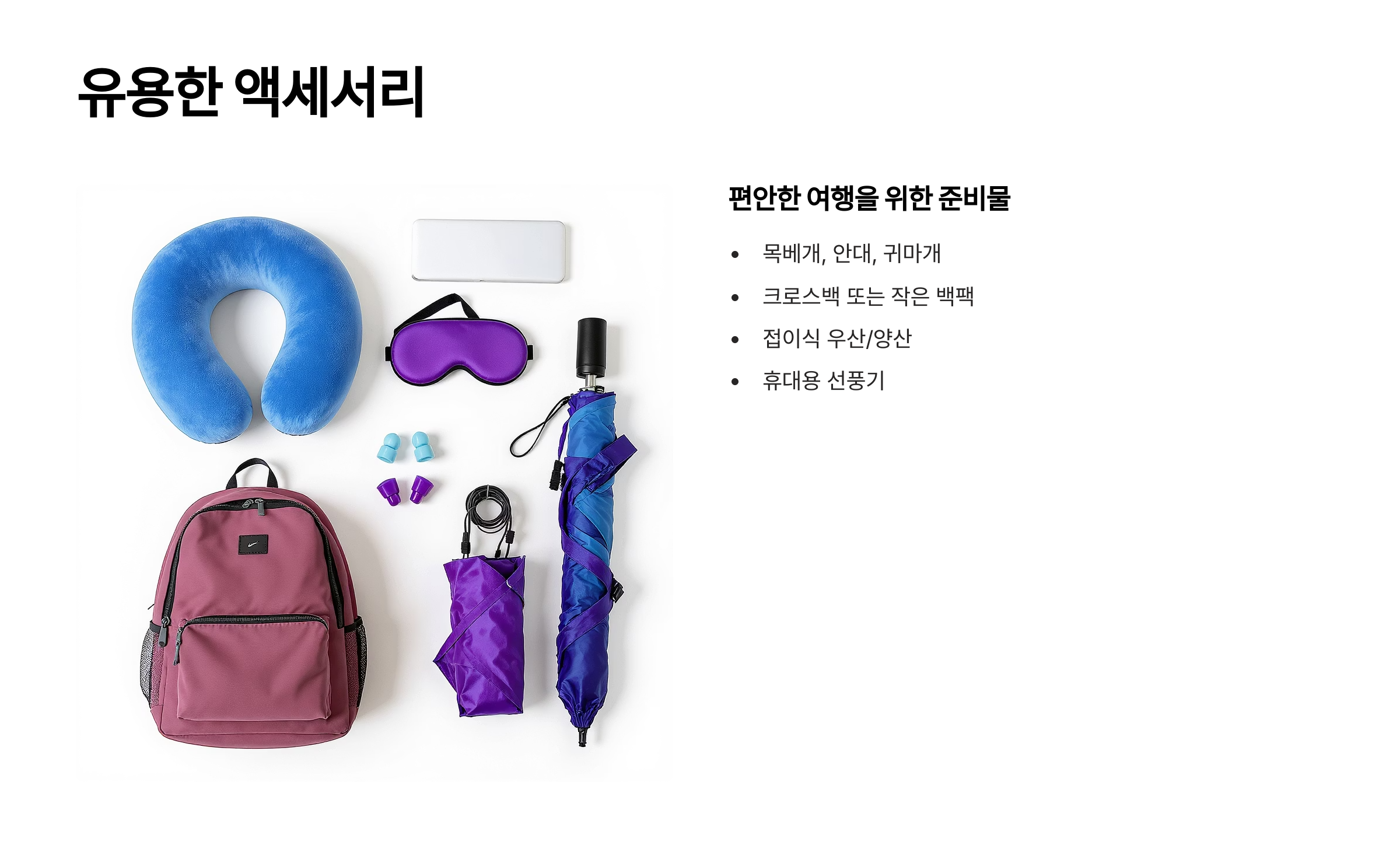 이 외에도 목베개, 안대, 귀마개 등 비행 중이나 이동 중에 편안함을 더해줄 액세서리들도 챙기면 좋답니다. 여행은 체력 싸움이니, 휴식을 취할 때 도움이 되는 아이템들은 정말 소중해요.