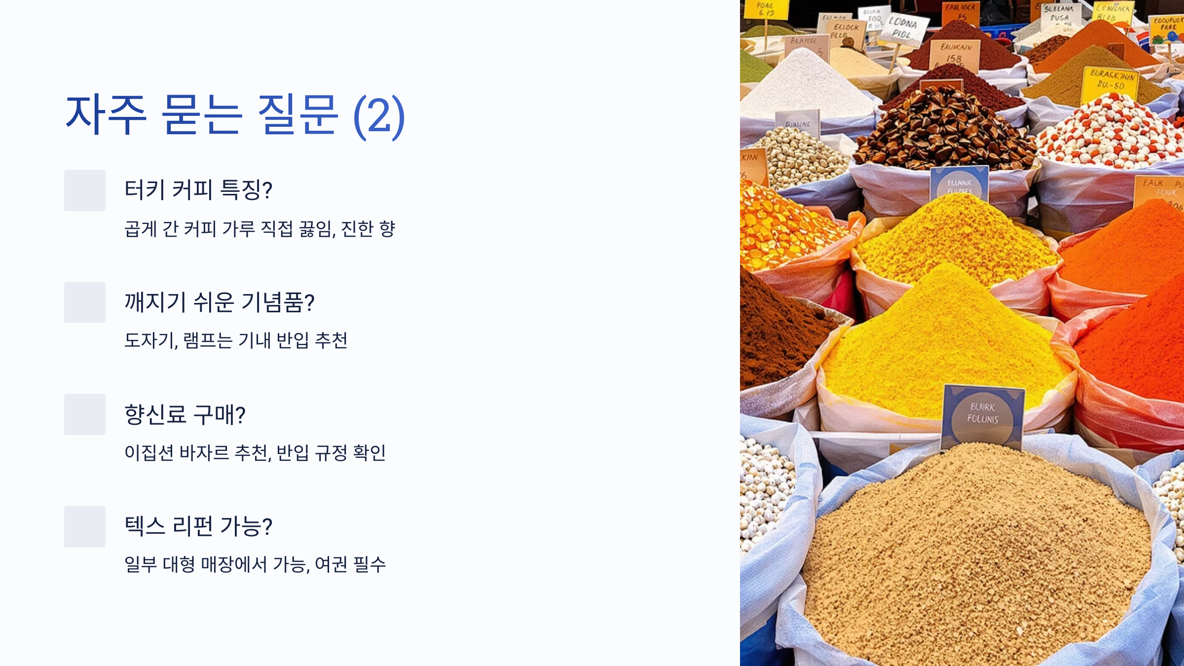 | 직장 동료 | 터키 커피, 드라이 프루트 | 간편함, 부담 없는 선물 |
