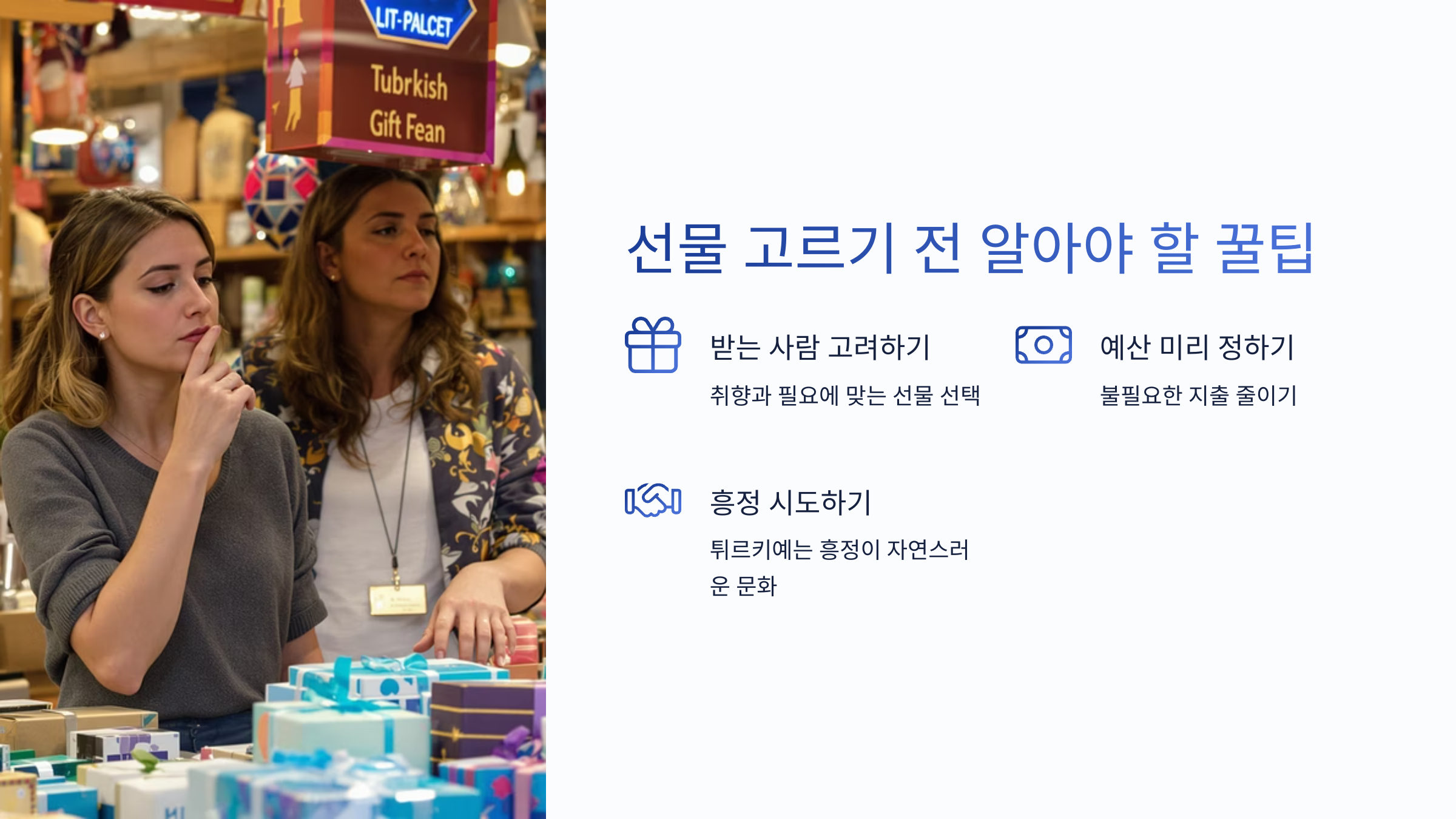 튀르키예는 동서양의 문화가 조화롭게 어우러진 신비로운 나라인데요, 그만큼 독특하고 매력적인 선물들이 많아요. 하지만 너무 많아서 뭘 골라야 할지 고민될 때가 있죠. 가장 중요한 건 선물을 받을 사람의 취향과 필요를 고려하는 거예요.