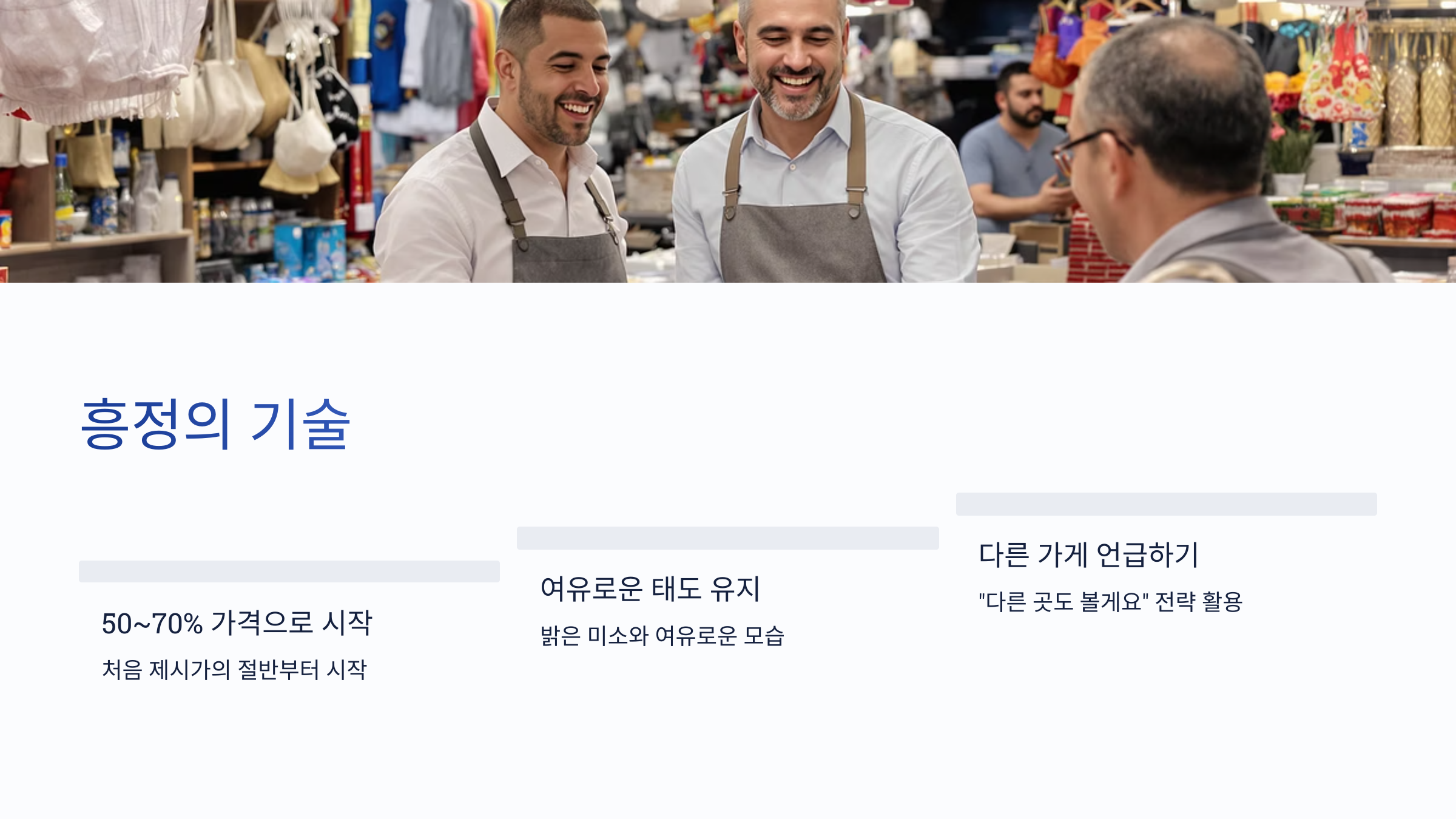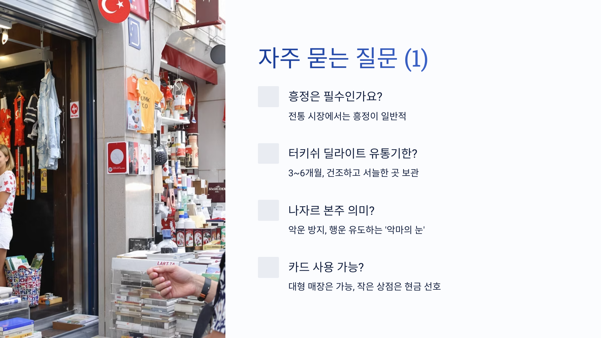 "터키에서는 흥정이 일상화되어 있어요. 처음엔 어색할 수 있지만, 흥정을 통해 현지 문화를 경험하고 더 좋은 가격에 물건을 살 수 있는 기회이기도 합니다. 하지만 너무 무리한 흥정은 상인들에게 실례가 될 수 있으니 적절한 선에서 서로 만족할 만한 가격을 찾는 것이 중요해요."