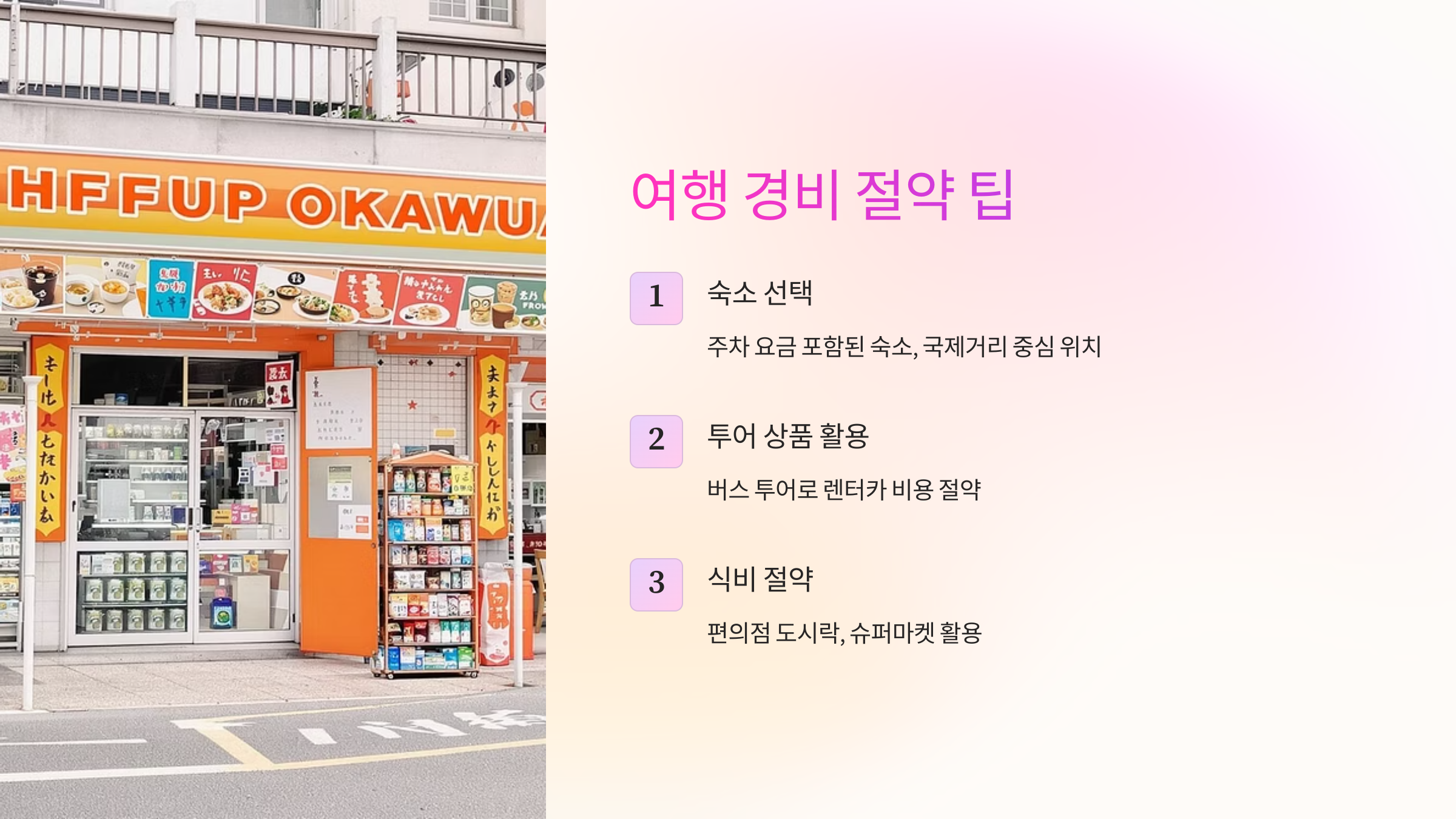 일본 여행에서 식비는 무시할 수 없는 부분이에요. 매 끼니를 비싼 음식점에서 해결하기보다는, 편의점 도시락이나 슈퍼마켓에서 파는 신선한 재료를 활용해서 간단하게 식사를 해결하는 것도 좋아요. 특히 오키나와는 신선한 해산물이 많으니, 시장에서 구매해서 숙소에서 간단히 즐기는 것도 좋은 방법이랍니다. 국제거리 주변에는 저렴하면서도 맛있는 로컬 식당들도 많으니, 현지인 맛집을 찾아보는 재미도 쏠쏠할 거예요.