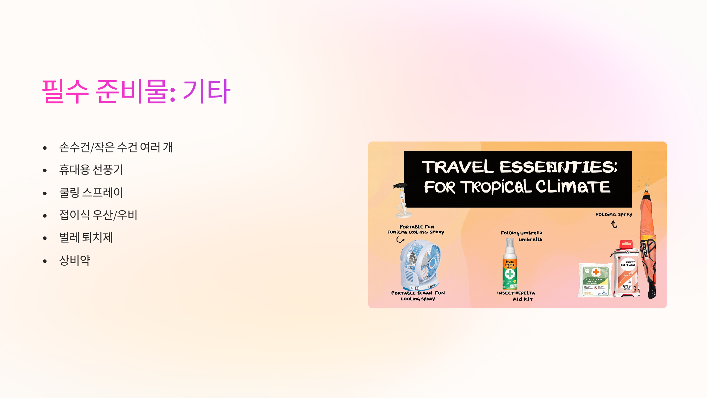 | 기타 | 손수건, 휴대용 선풍기, 우산/우비, 벌레 퇴치제, 상비약 | 더위 및 비 대비 |