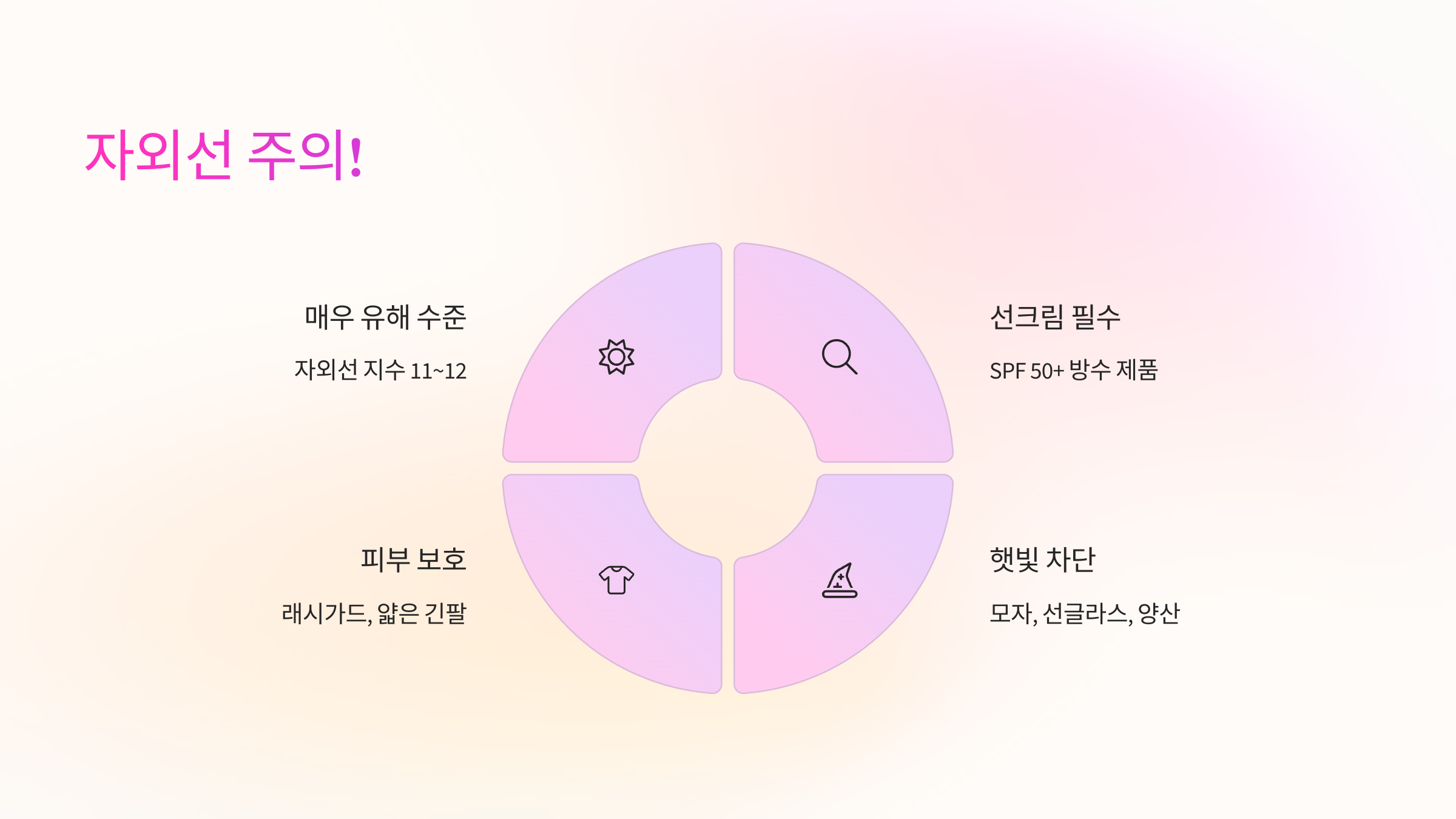 | 햇볕 차단 | 선크림(SPF 50+ 방수), 모자, 선글라스, 양산 | 수시로 덧바르기 |
