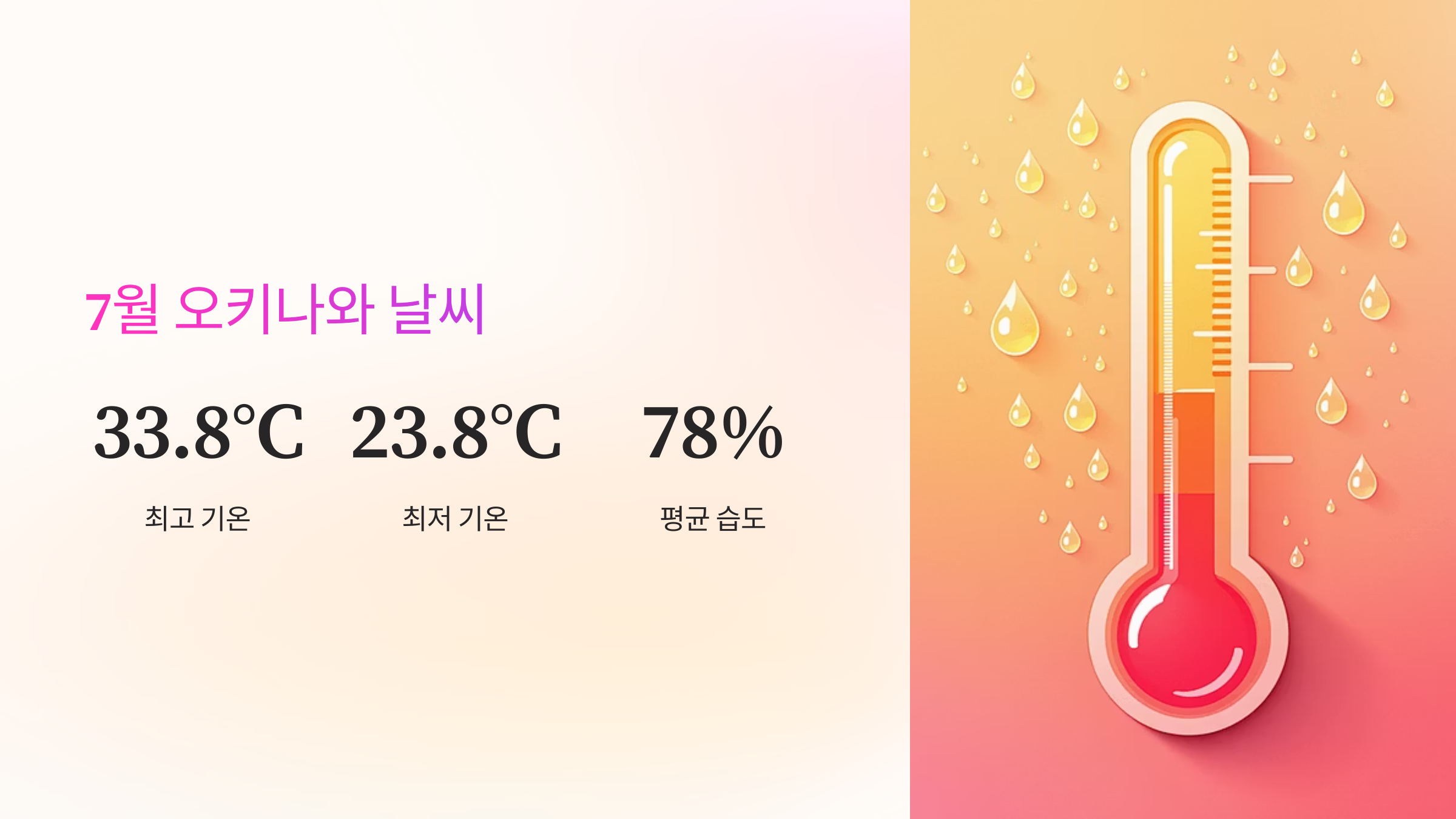 오키나와의 7월은 본격적인 여름이 시작되는 시기예요. 평균 기온이 29도에서 30도를 넘나들고, 최고 기온은 33도 이상까지 올라가는 경우가 흔하답니다. 여기에 습도까지 80%에 육박해서 실제 체감 온도는 훨씬 더 높게 느껴질 거예요.