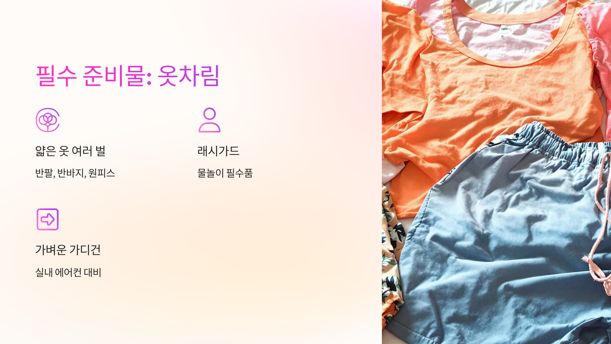 | 의류 | 반팔, 반바지, 얇은 원피스, 래시가드, 얇은 긴팔 겉옷 | 통풍 잘 되는 소재, 여벌 옷 넉넉히 |