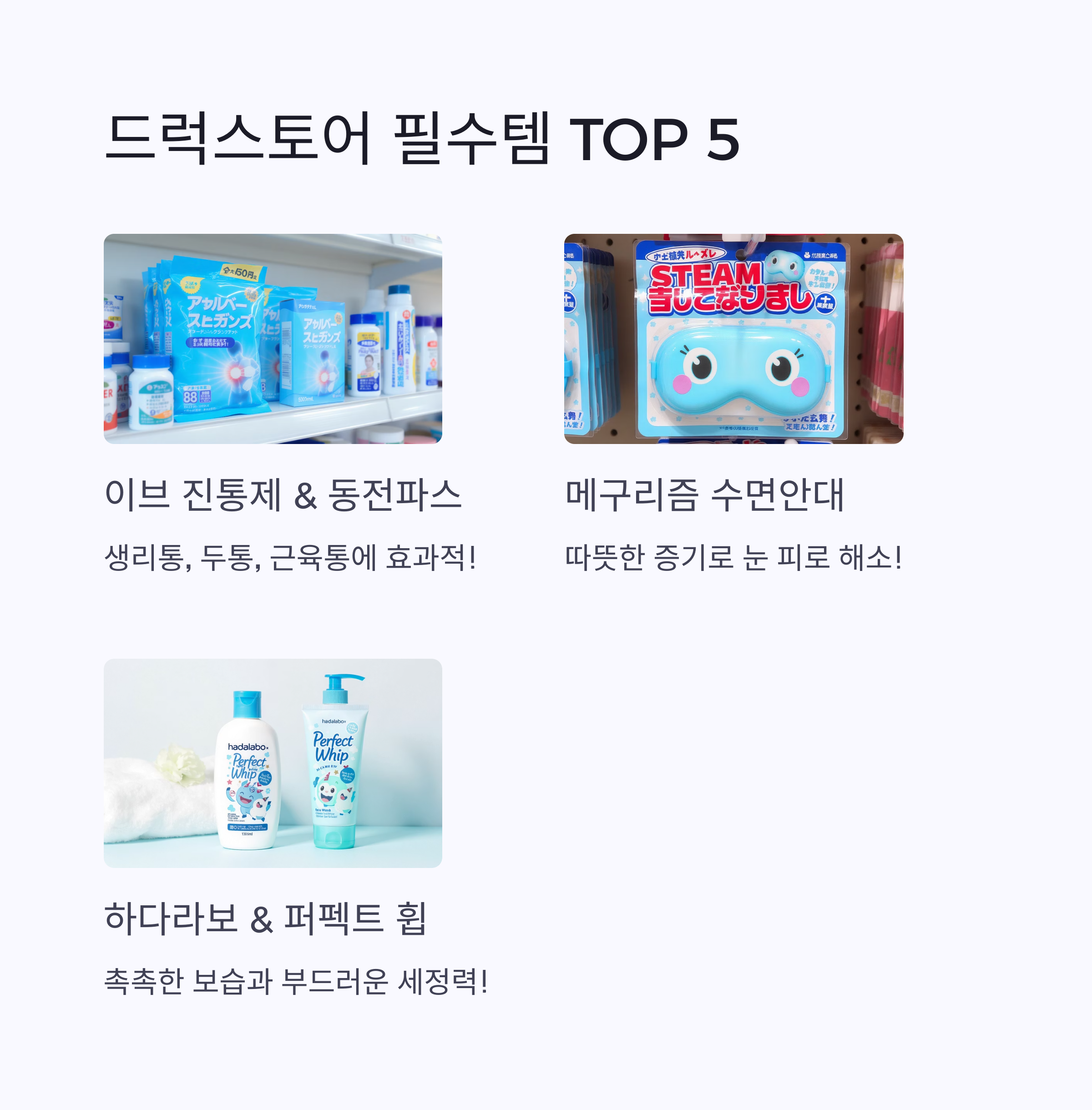 일본 드럭스토어 쇼핑리스트에 빠지지 않는 것이 바로 의약품이죠. 이브 진통제는 생리통이나 두통에 탁월한 효과를 보여서 많은 여성분들이 꼭 쟁여오는 아이템이에요. 로이히츠보코 동전파스와 샤론파스는 어깨 결림, 근육통에 시원한 느낌을 주어 부모님 선물로도 인기가 많답니다. 메구리즘 수면안대는 따뜻한 증기로 눈의 피로를 풀어줘서 비행기 안이나 잠들기 전에 사용하면 정말 꿀잠을 잘 수 있어요.