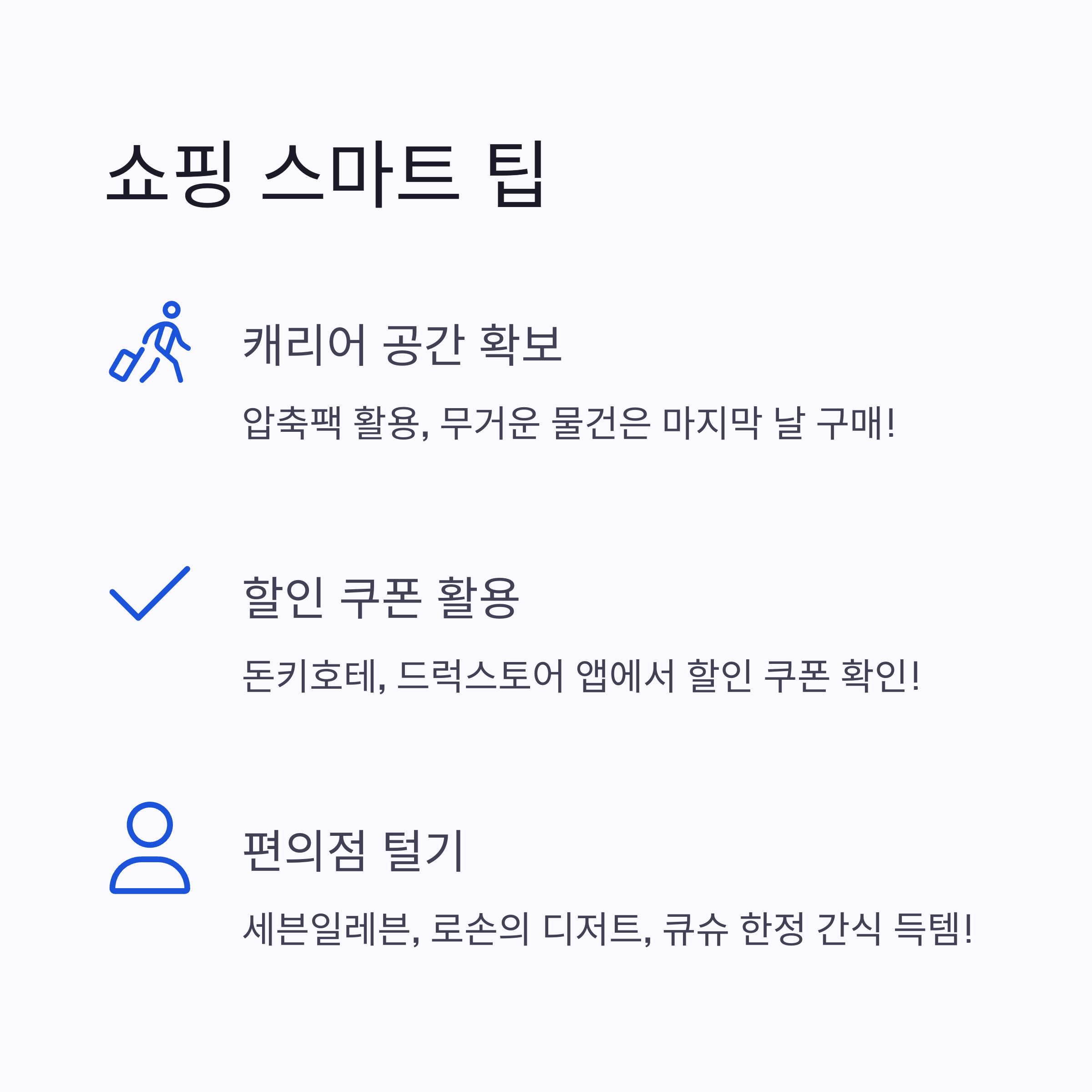 면세 쇼핑 팁 하나 더! 온라인 면세점이나 사전 예약 서비스를 이용하면 더 많은 할인 혜택을 받을 수 있는 경우도 있으니 출국 전에 미리 확인해보세요.