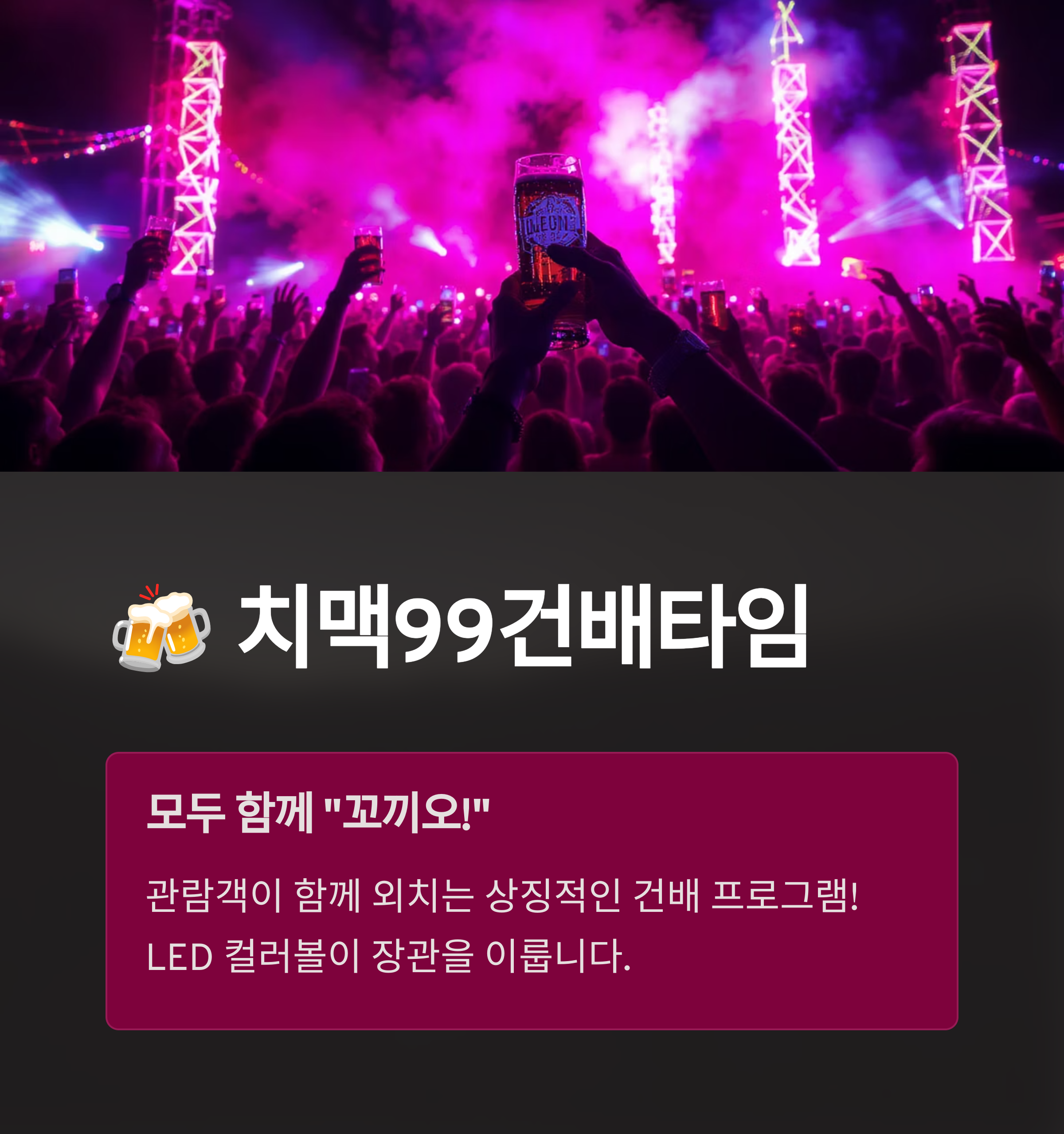 | 치맥99건배타임 | 관람객들의 상징적인 건배 프로그램 |